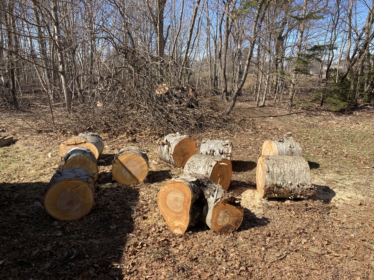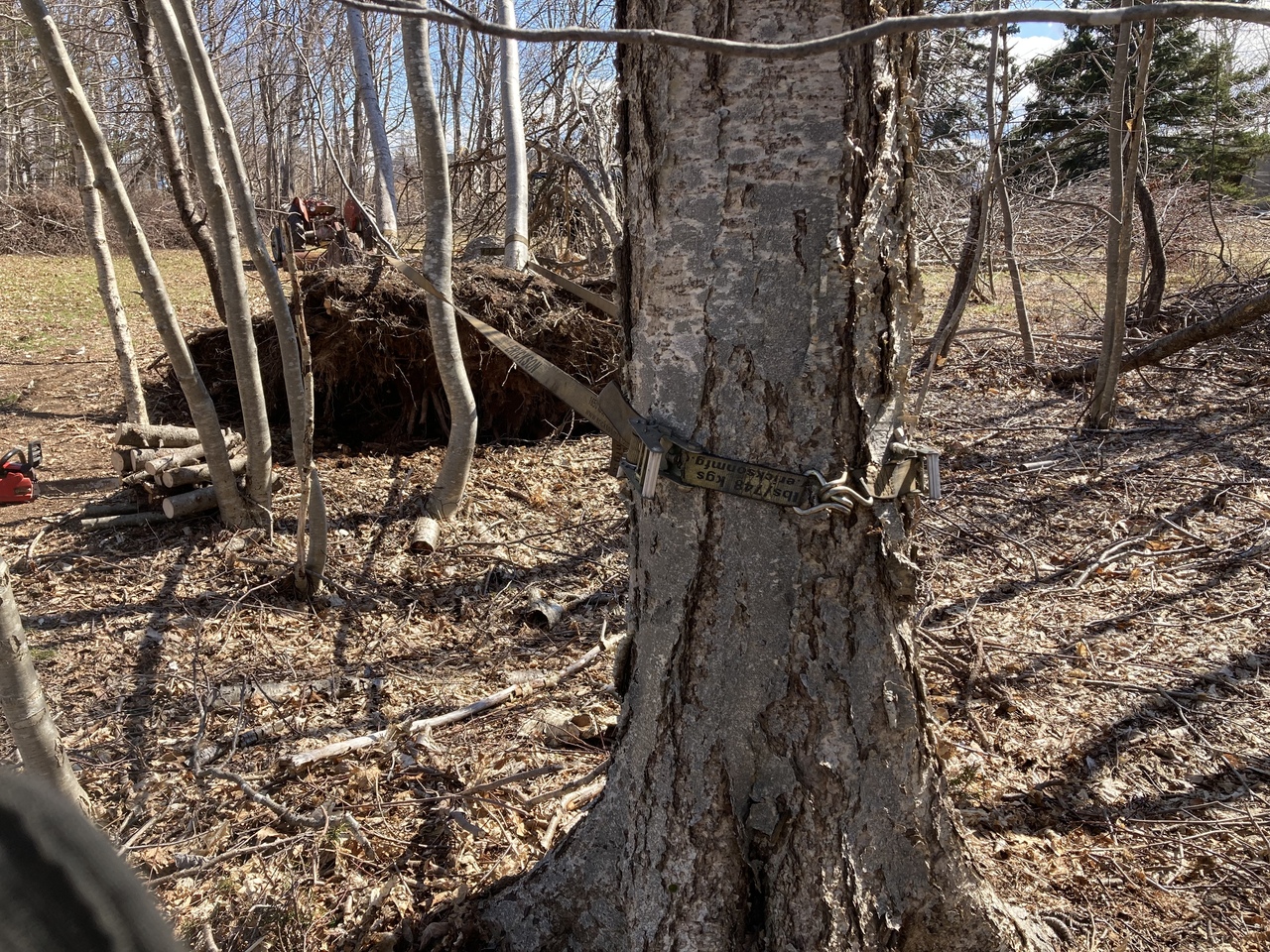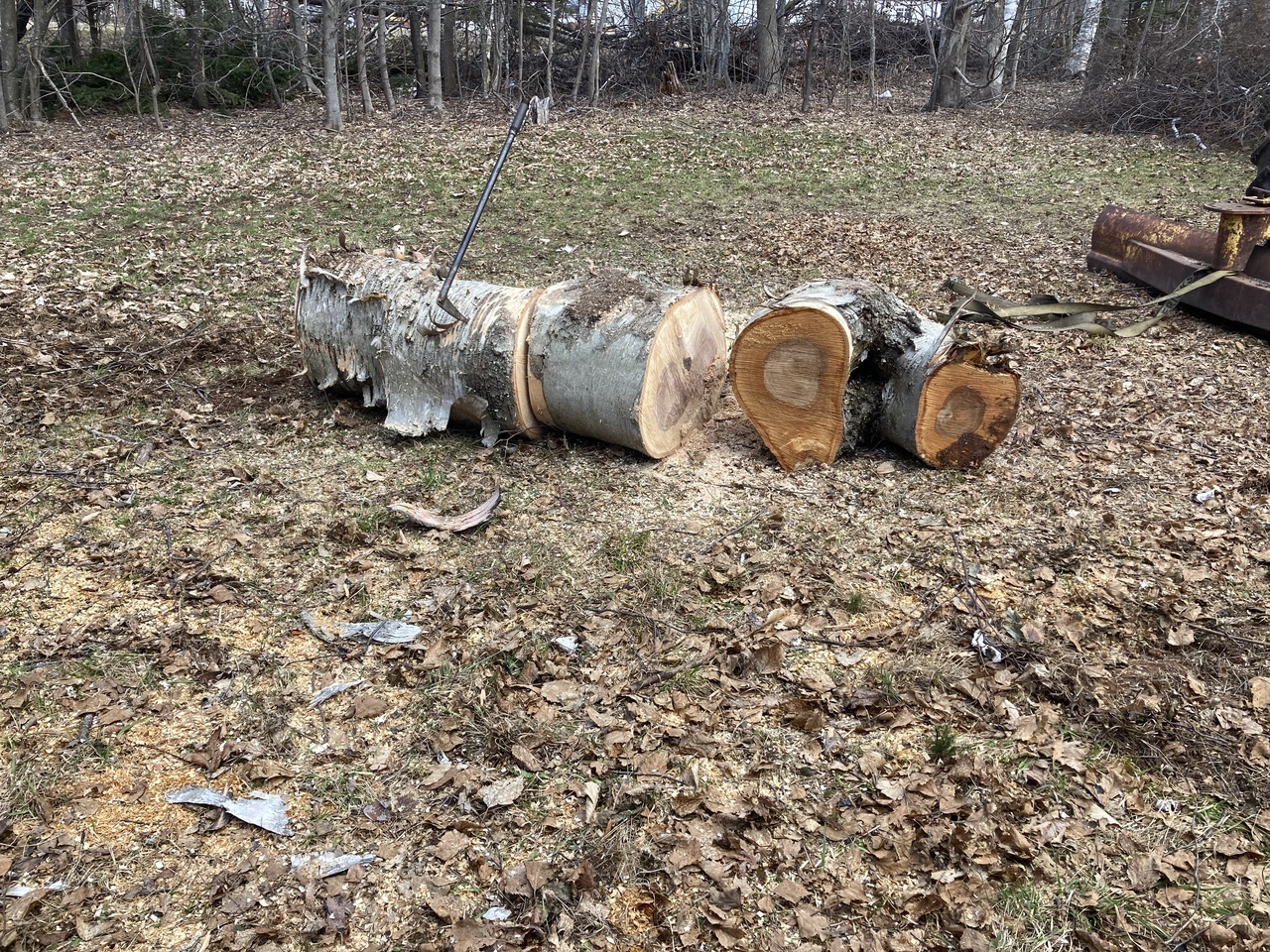 Birch trunk all cut up today. And once I got the truck off noticed the maple trees started going back up. Root was almost up at 90 degrees, now after a few hours it back down to about 30 degrees. I doubt the maple trees will stand up straight, but as things settle more and they start to grow, they may not be to bad.