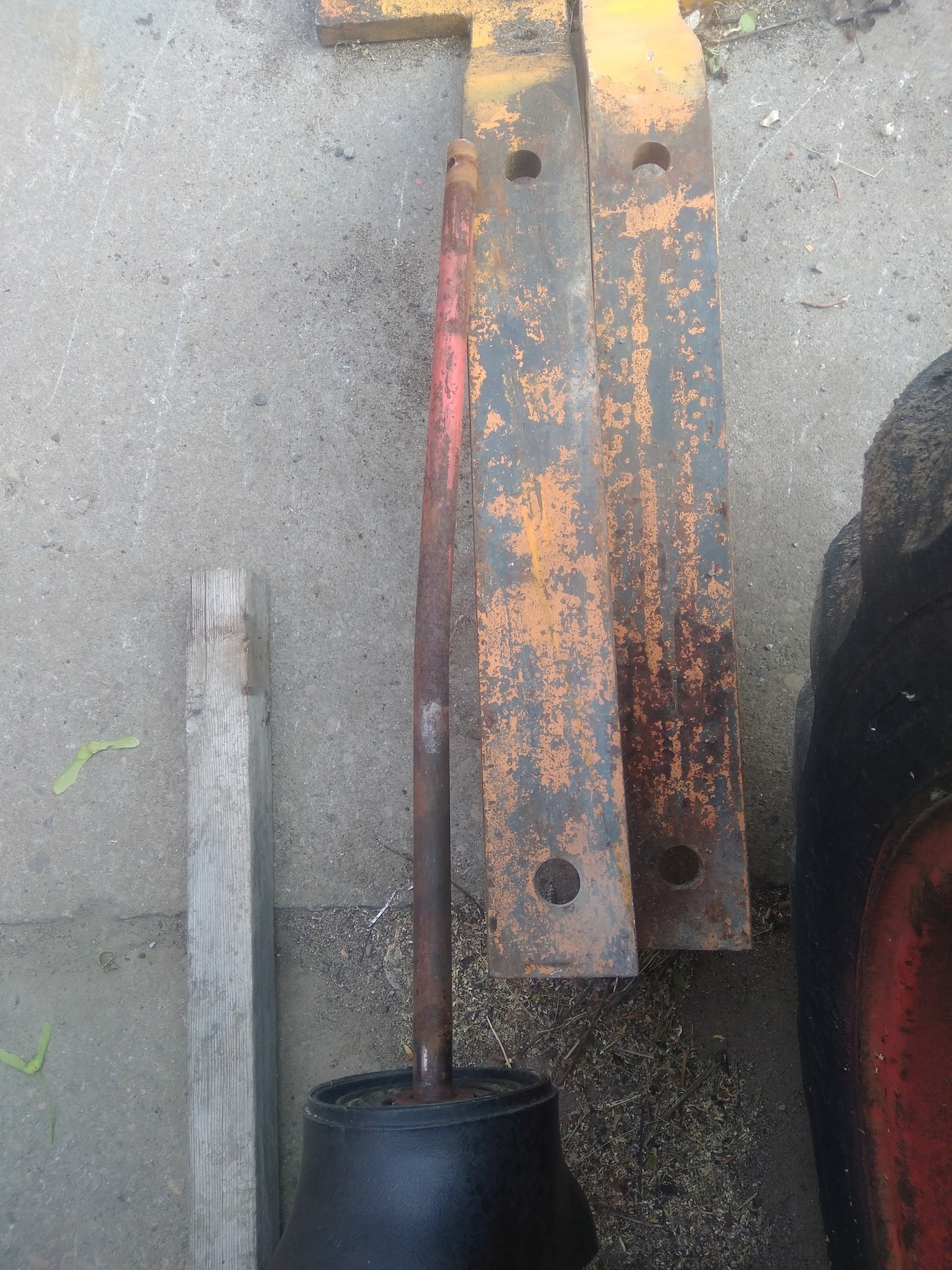 A day later being inspired by all of the cleaning, all of the hoe arms, 3 point mount and down rigger parts were taken to the sandblaster for prep and primer. Midafternoon today, the urge to surge on hit. The intent is to use the 646L which is minus motor, travel control valve, loader control valve and other stuff as a donor frame for rebuilding the 646B . The 646L was partial restored with an incorrect red and yellow when a previous owner passed. This made parts removal much easier but the loader hinge pin was seized in place on the left side loader arm. Driving the hinge pin using brass drive only spread the loader arms. Using a load strap to pull the arms together and lubricating the pin at the hinge was enough to get movement.Wear groves in the rod indicate that it had not been replaced by the PO.The steering wheel shaft came out easily but the after market wheel is welded on and the shaft was bent. Further inspection indicated that the steering sector is extremely worn. At least there are 2 good wheels on recently purchased 224's and the 646B has a good sector that only needs bushings. The banana plate had pins welded in and the travel control ball joints are shot. Rebuilding the banana plate and travel control linkage will probably happen with the frame on stands bottom side up. Removing the rear axle from the donor frame did not bring any surprises. It was full of water as expected but appears to be very tight with low wear. With the 646L frame stripped it is ready to become a 646B Exposing the 646B transaxle top showed the typical grim build up and housing water entry point. Ouch, Not good, extreme axle wear was not on the agenda, but not a surprise considering all of the other issues found. Placing a jack under the axle housing let the axle drop about 3/8" The axles may have to be welded and turned for new bushings. Hopefully the housing is not damaged. The 646L was built a year before the 646B was introduced. Backhoe mounting brackets and weight bar hangers need to be added to the 646L frame. 4 holes will be drilled on the under side of the frame to mount the brackets.