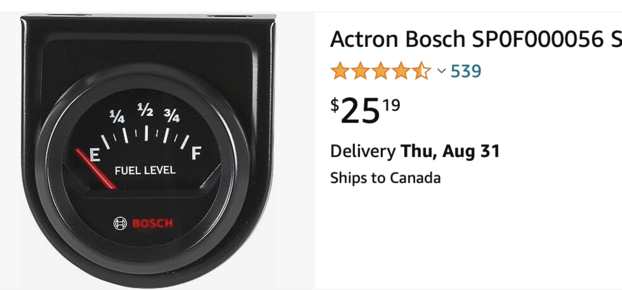 I have added the 2" Bosch dial and tank sender sensor to the boat I had previously, and it worked flawlessly; got them on Amazon, and total price was about $50 CAD.