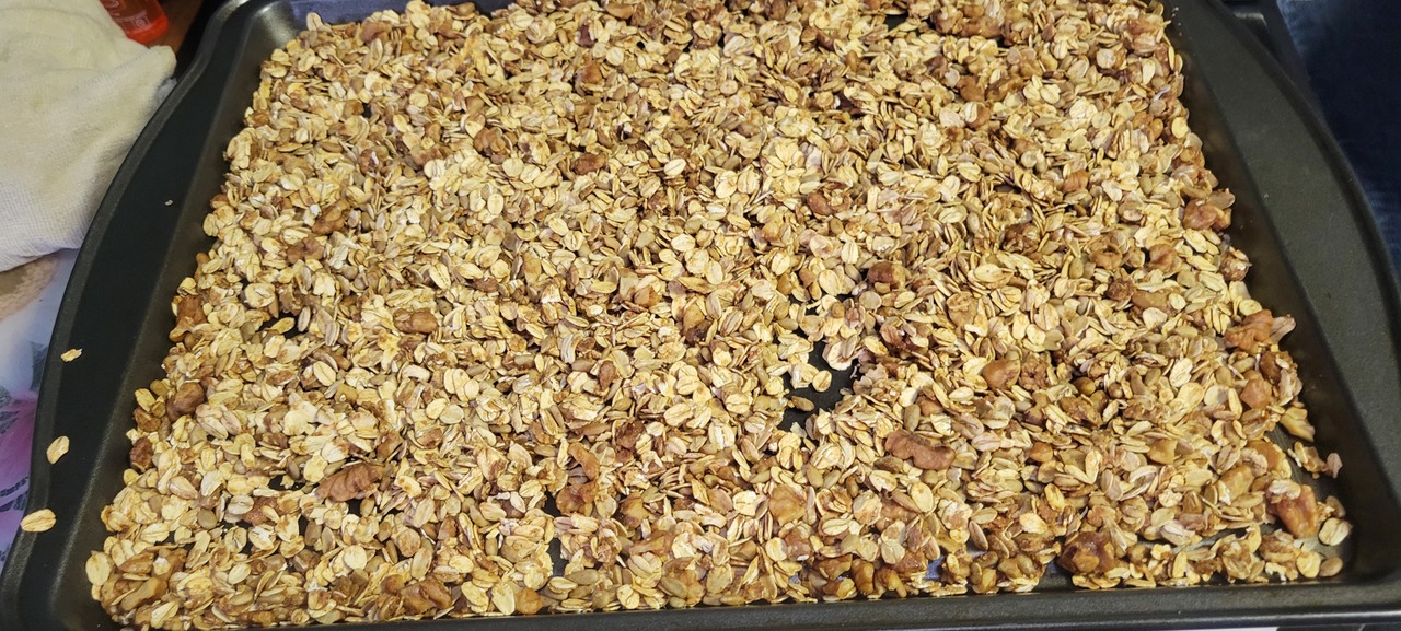 @Eugen That big pot is apples for sauce. M likesa brand of granola that is hard to find sometimes. I use 2 cups large flake oates, 1-1/2 cups of mixed nuts or seeds, whatever is on hand, sunflower, pumpkin, walnuts, cashews,..... flavor with 1/8cup brown sugar, 1/ tsp cinnamon, 1/4 tsp nutmeg, 1/8 tsp cloves. Mix dry ingredients. Add to the mix 1/8 cup honey, 1/8 honey and 1/2 tsp vanilla. Bake on cookie sheet 30 minutes at 325. Stir every 10 minutes.