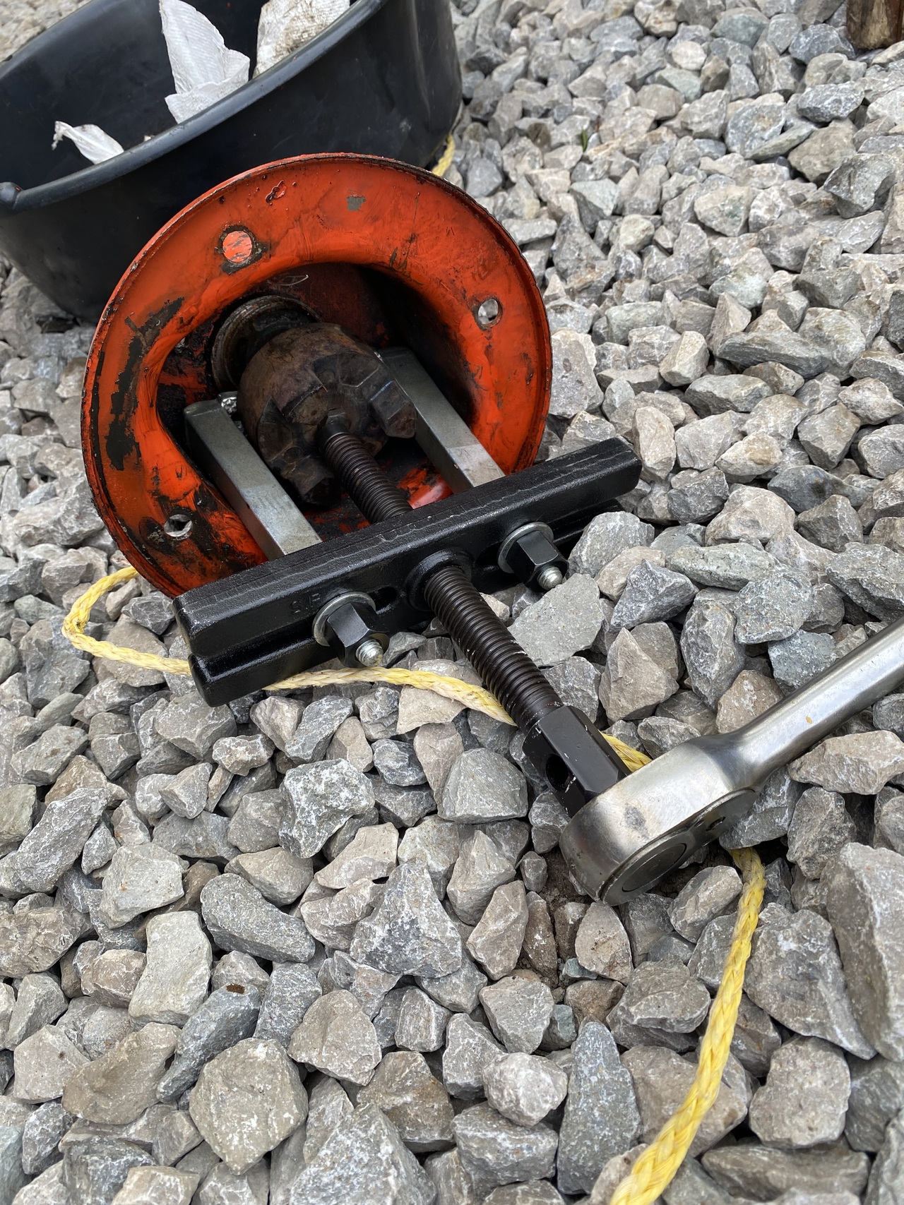 The engine is in but the pump housing from the JD engine wasn't a good fit. So, off to the old rusty 444 to get the pump housing from it. Except the screw in the lovejoy on the pump shaft was stuck. Heat and pb blaster did nothing.