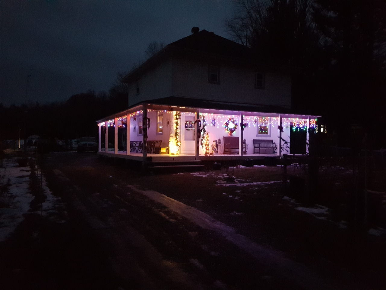 Nothing special here. Just a long string of lights along the drive. The first year they were about 4ft off the ground. Dumb idea, deer ran through them after turning them off at night.