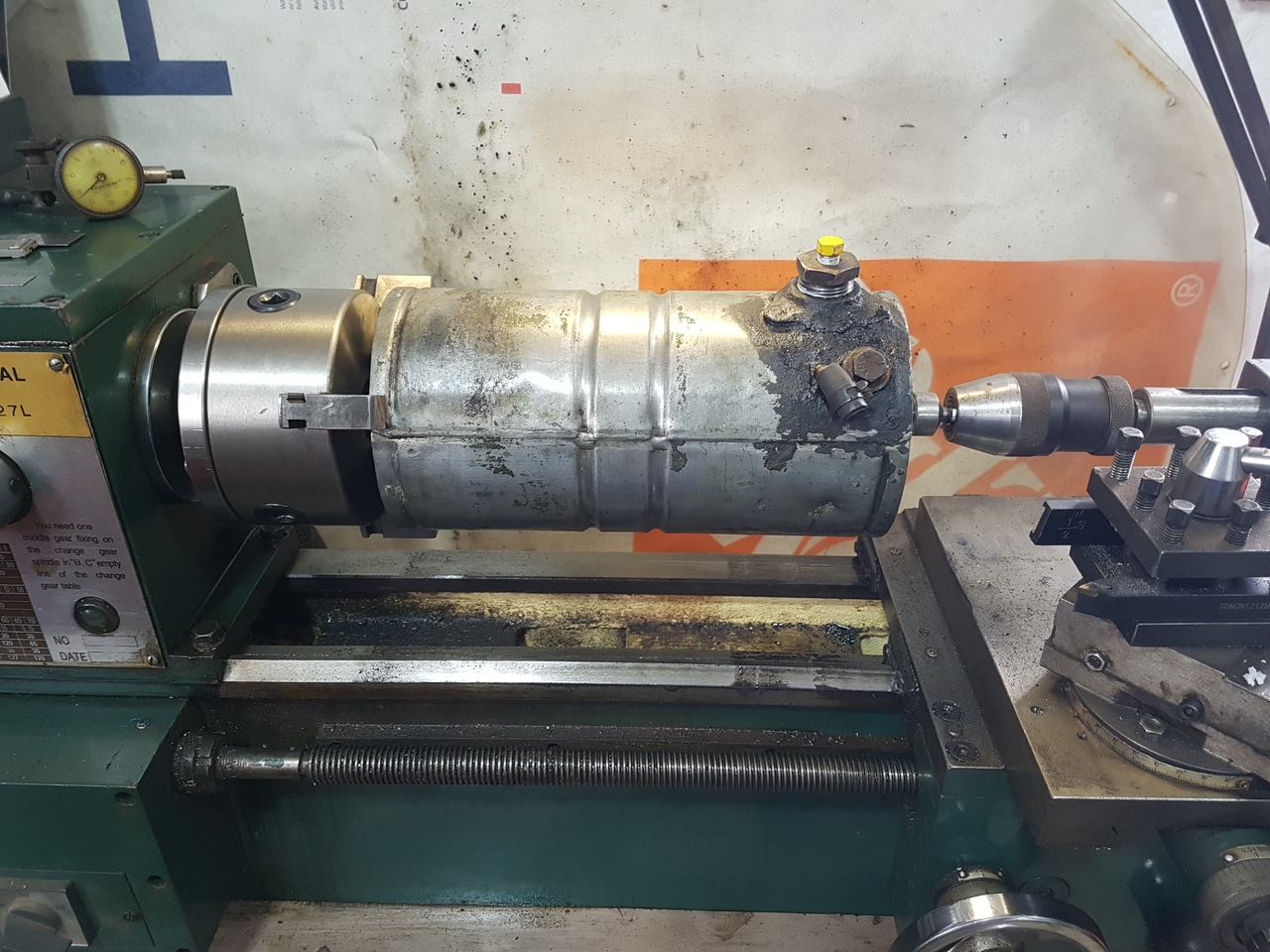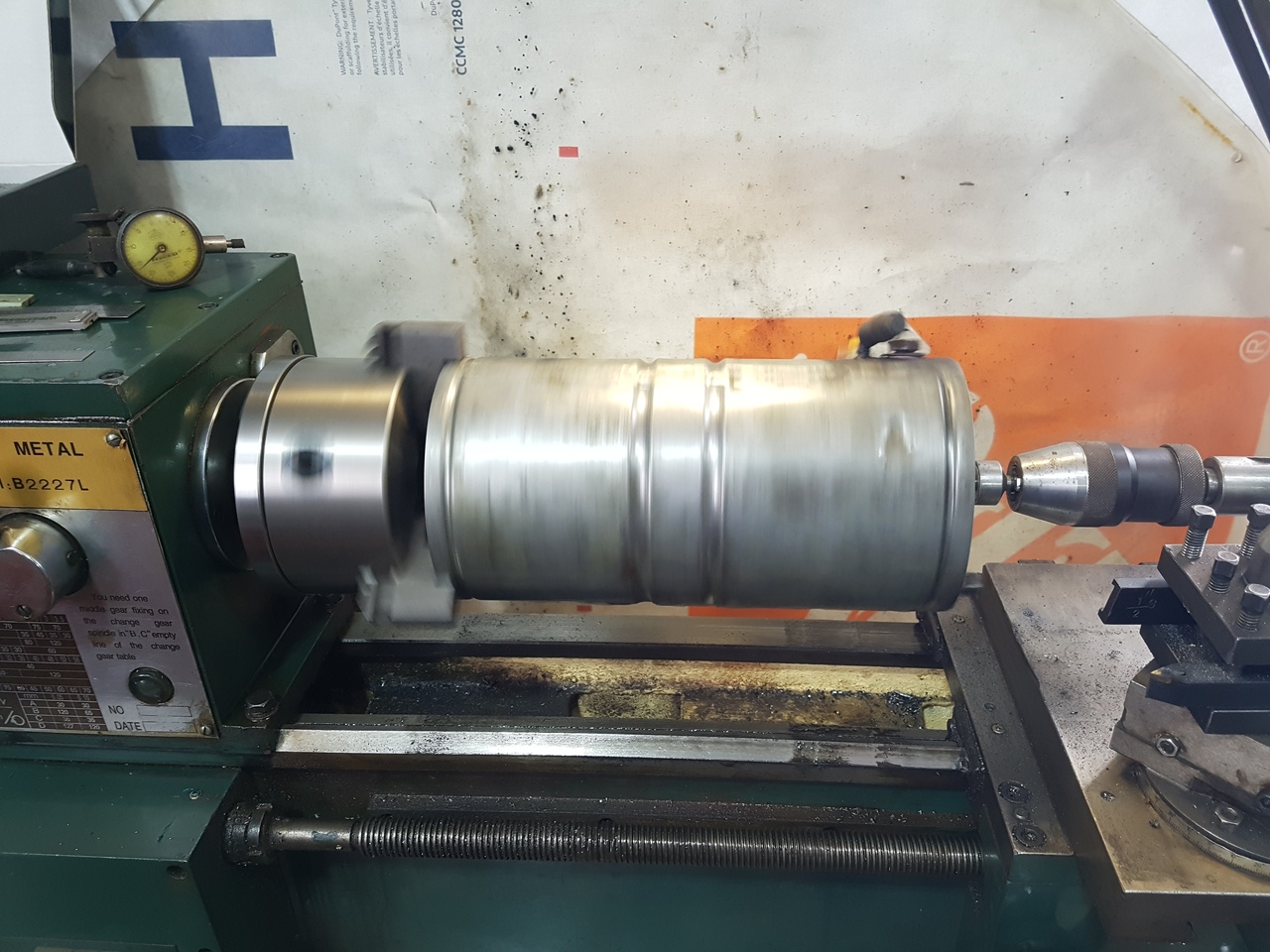 The gas tank looked pretty bad in side and had a big solder patch on the bottom of it . So I mounted it in the lathe on the slowest speed with a hand full of nut and evapo-rust and let it go for a while .