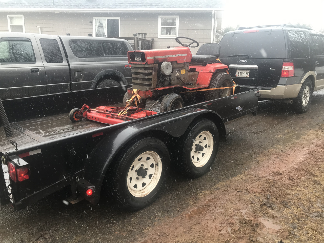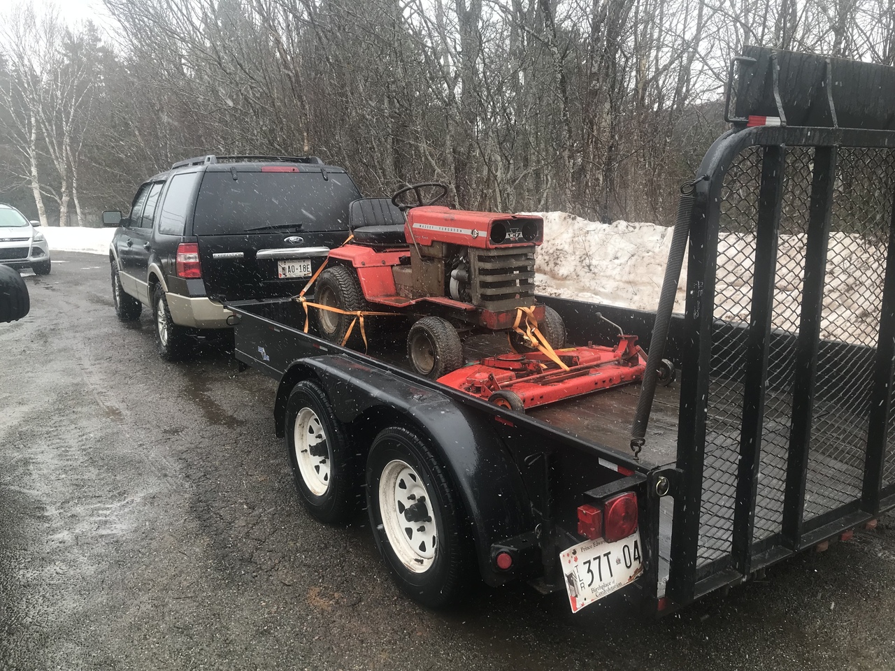 Well, this came home today. Now, it’s not mine. My son paid for it. It’s here until he clears a spot in his garage for it. It runs good we drove it around the house thru the mud and snow. Motor sound good too. Motor is a 1989 from what I can figure out. Tractor is a 1975. Pto doesn’t not work. Which is what he told us. Looks to be melted. Will have get the grill off for a better look and testing.