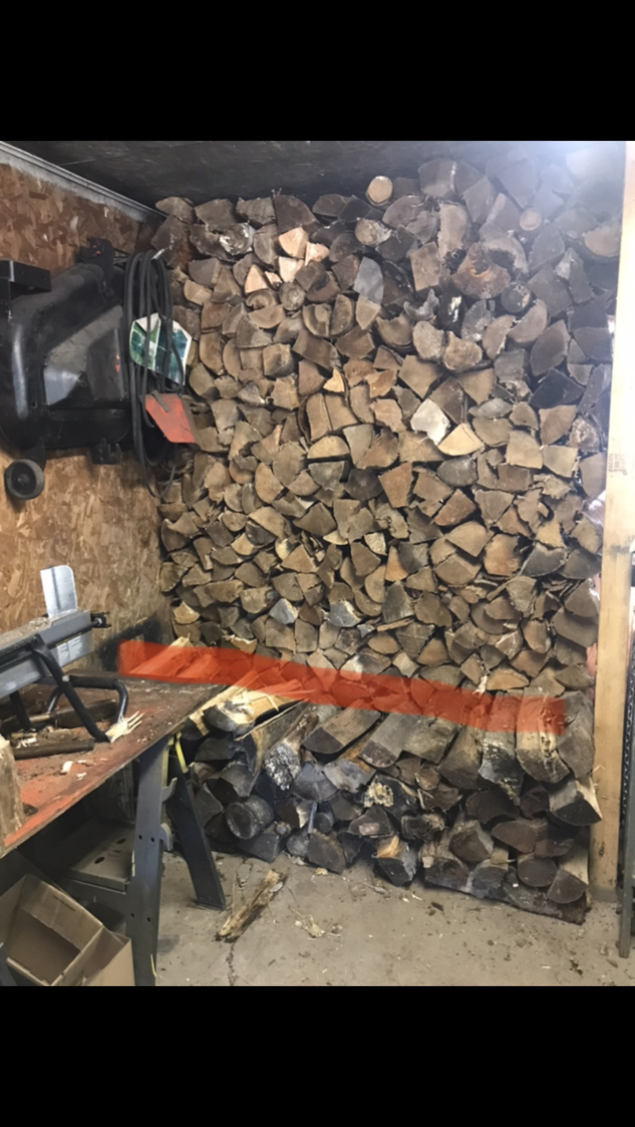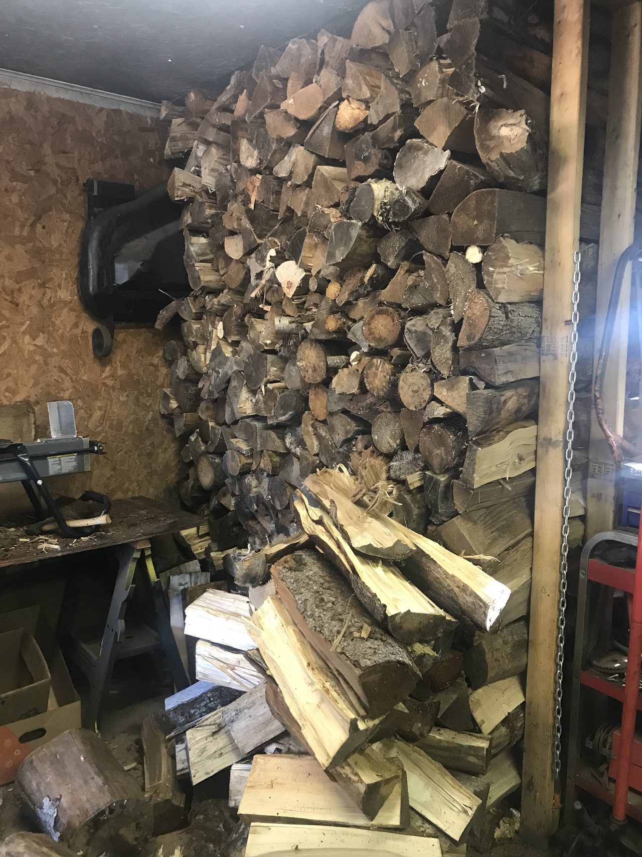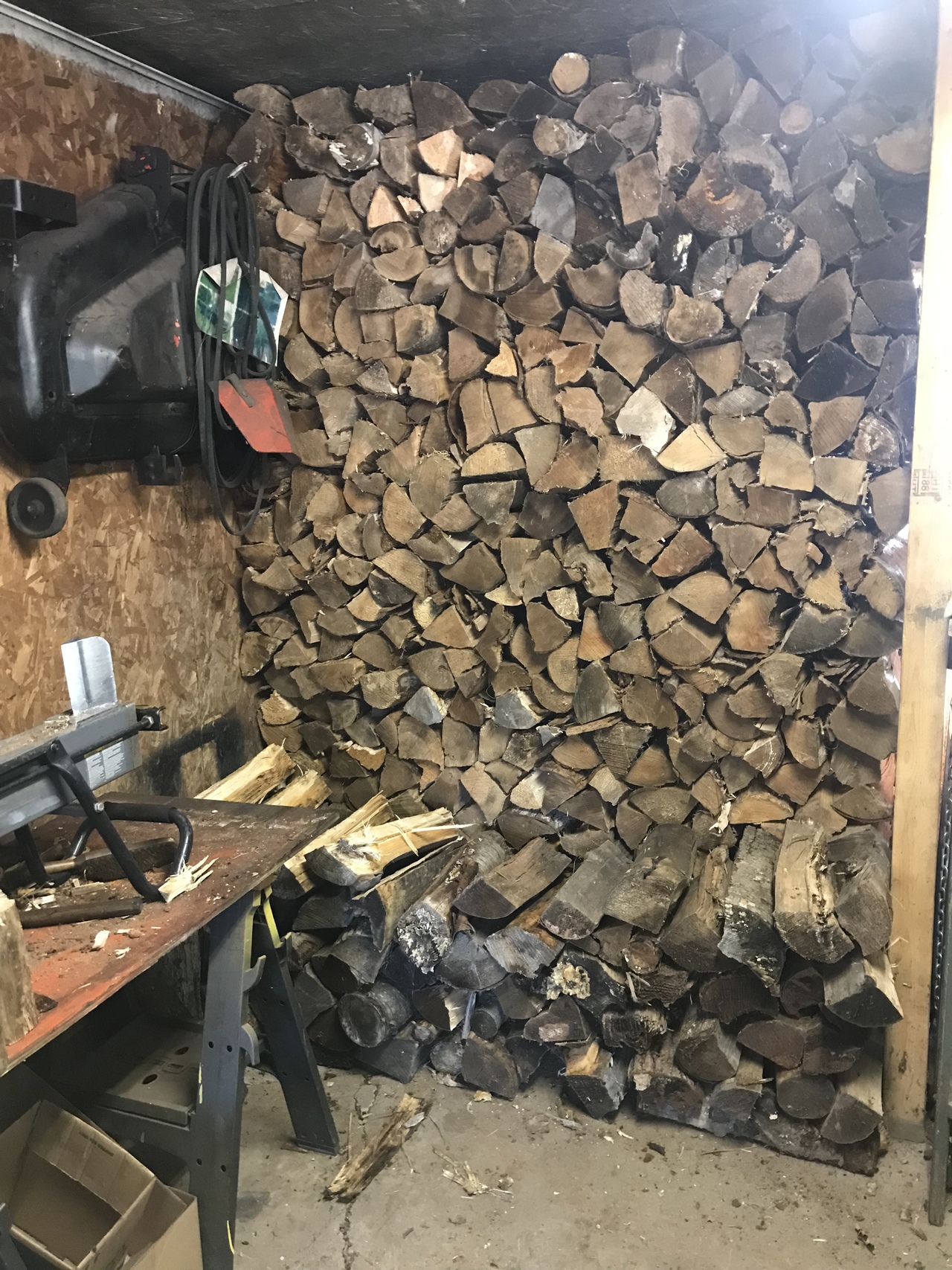 Well a little more done today. Each time get the load from my neighbour, it’s about 1/4 to 1/3 or so of a cord. So finished the row I was working on yesterday. Now I have to move the wood spliter and fill that wall. Floor to ceiling, from the stacked wood on the right, over to the air compressor and two rows deep. Hard to see the compressor, but it’s at the end of the table the wood splitter is on. Got some ready to stack there.