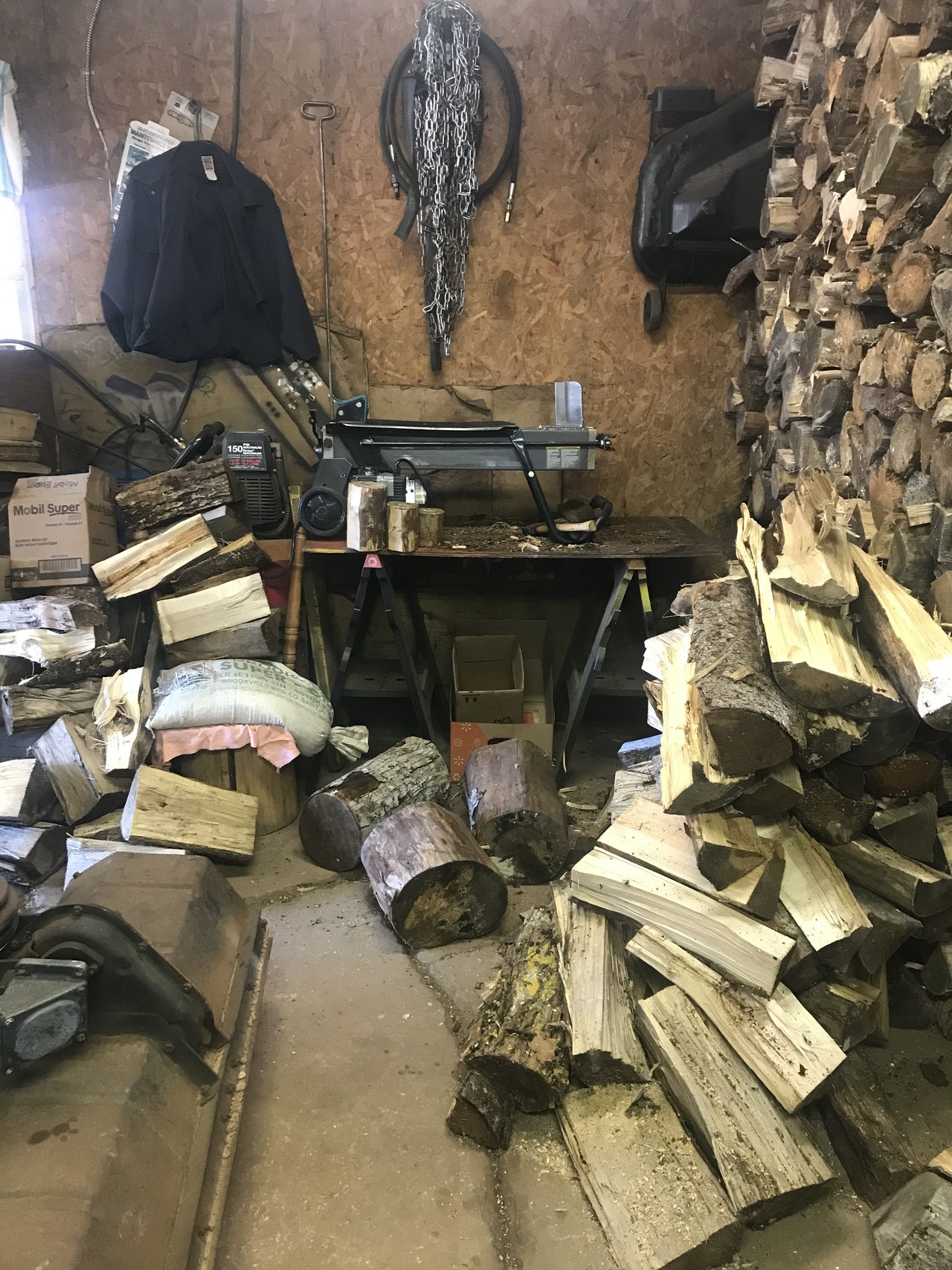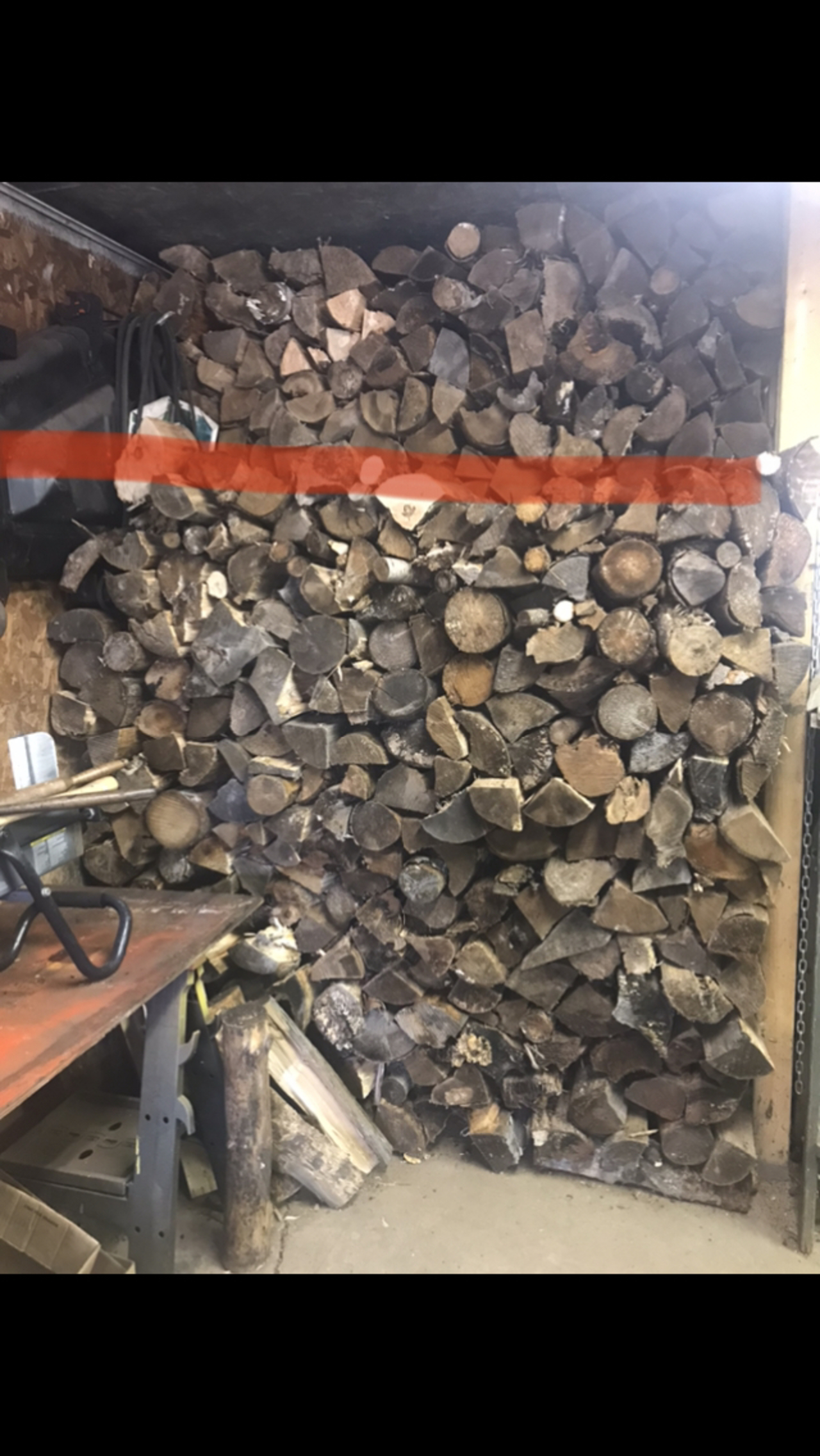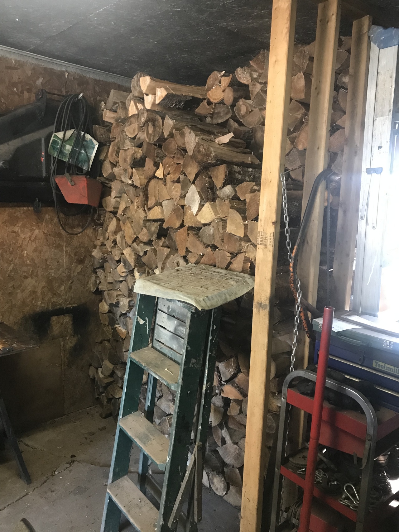 Well a little more done today. Each time get the load from my neighbour, it’s about 1/4 to 1/3 or so of a cord. So finished the row I was working on yesterday. Now I have to move the wood spliter and fill that wall. Floor to ceiling, from the stacked wood on the right, over to the air compressor and two rows deep. Hard to see the compressor, but it’s at the end of the table the wood splitter is on. Got some ready to stack there.