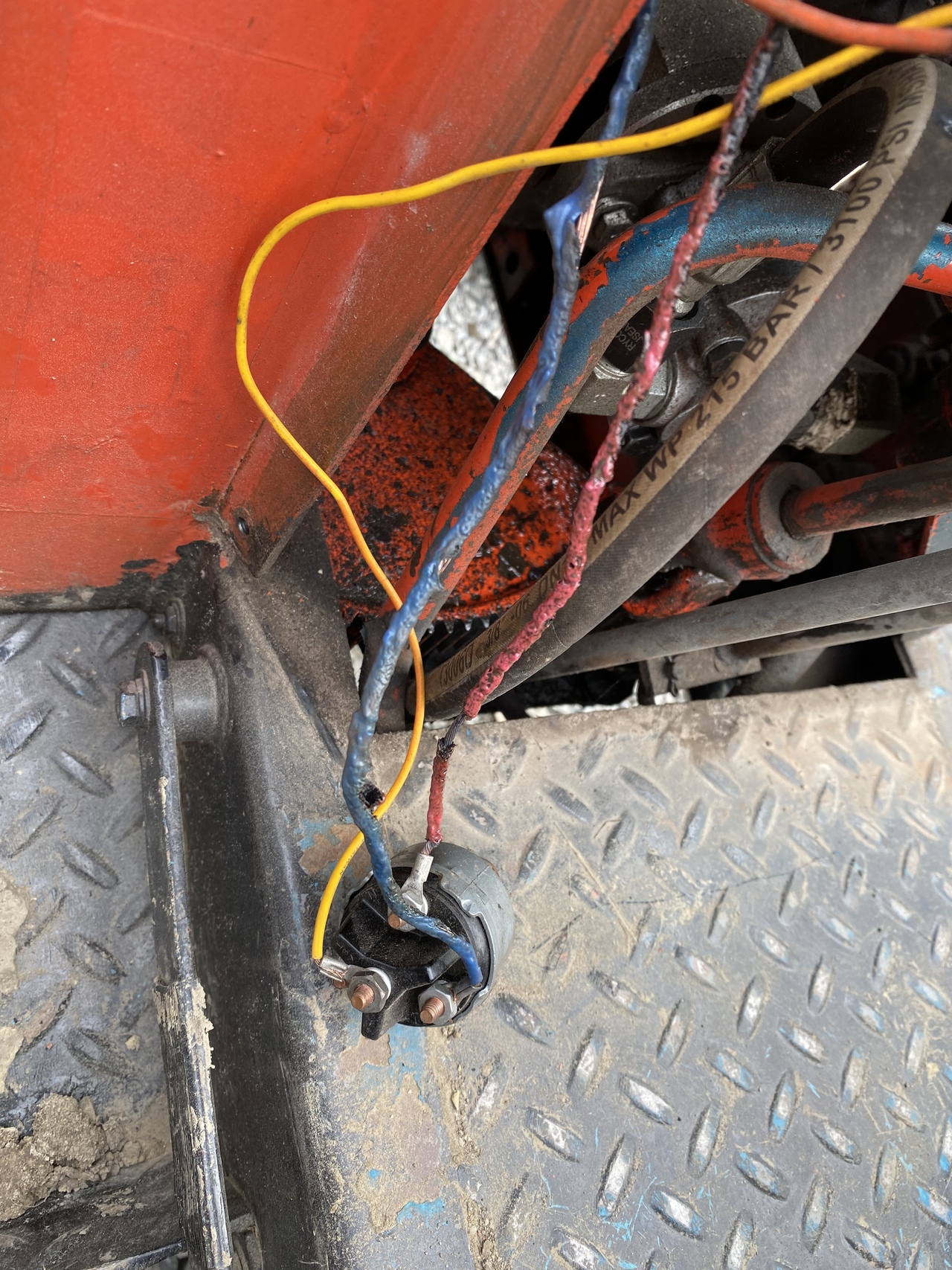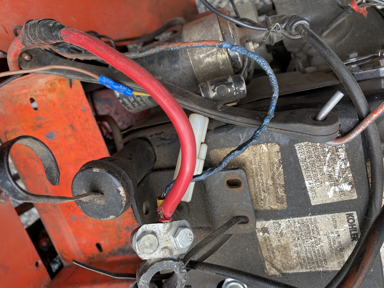 Upon closer inspection it seemed that the insulation was melted only on half the wire. Maybe it got pinched at that spot and shorted to ground? Not sure, but from that spot the melted insulation went to IGN on the switch, then out the BAT terminal to the positive post on the battery, another wire with melted insulation. Made new wires with proper contacts, and that got me back to regular schedule, moving and spreading gravel.