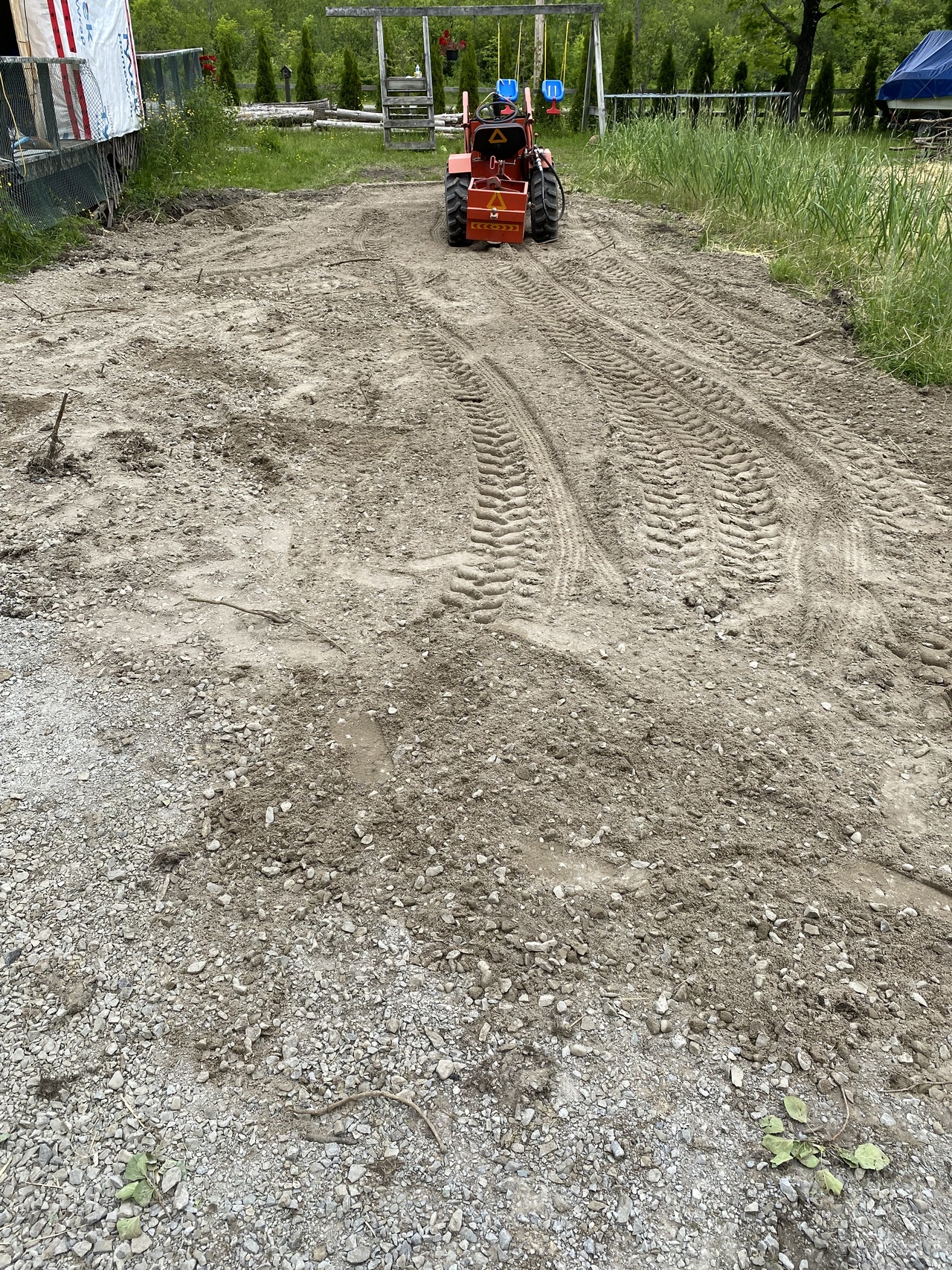 Early morning yesterday I made a last effort to level the ground and once the gravel arrived I declared the area ready for it. The 644 is no bulldozer that's for sure. I'm not sure if it's easier to level dirt with a blade, but the other tractor that I could put a blade on doesn't have any way of hooking a weight box on the back and has no AG tires, so I did what I could with the 644 bucket.