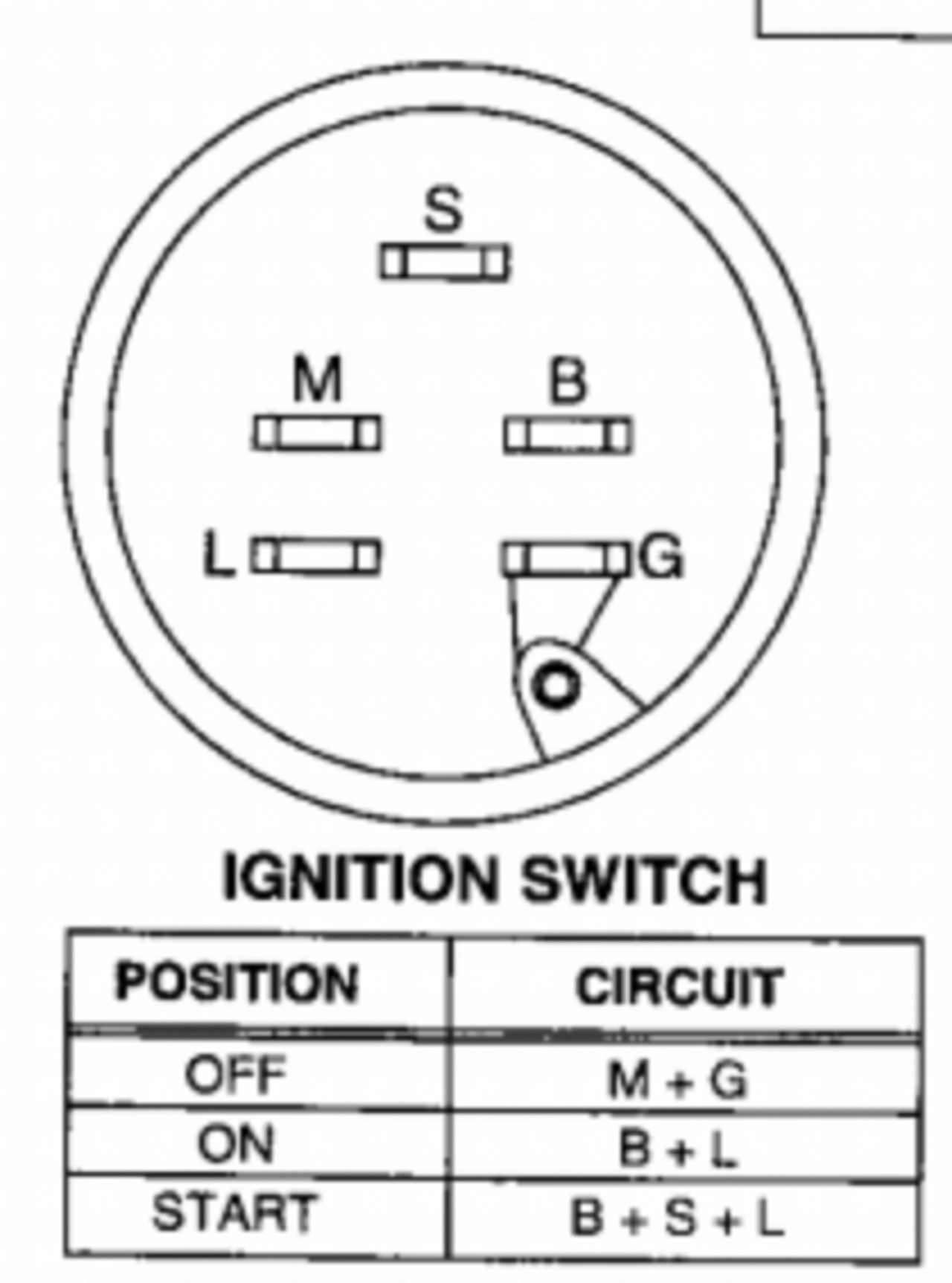 I think this applies to your S, A, M, B, G. Just replace A (accessory) with L (lights). Better yet, measure with an ohmmeter and see how you can assign terminals to this diagram.