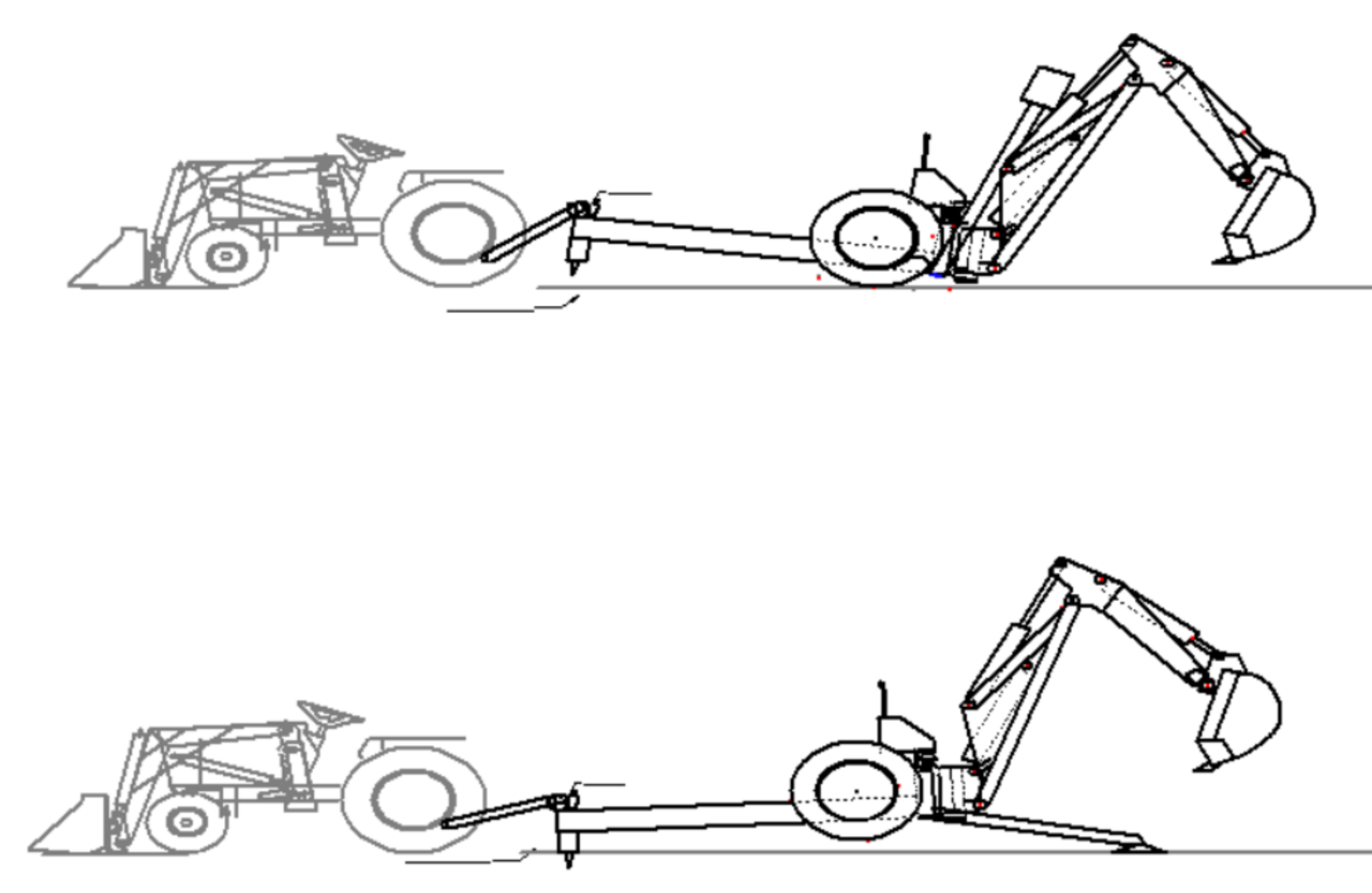 That would give you the benefit of using the heavier lift arms and the weight of the tractor as a counterweight with out needing to change how it’s attached once the hoe is in position to dig. And add stabilizers to the tractor end of the hoe. So you would have stabilizers at each corner of the hoe.