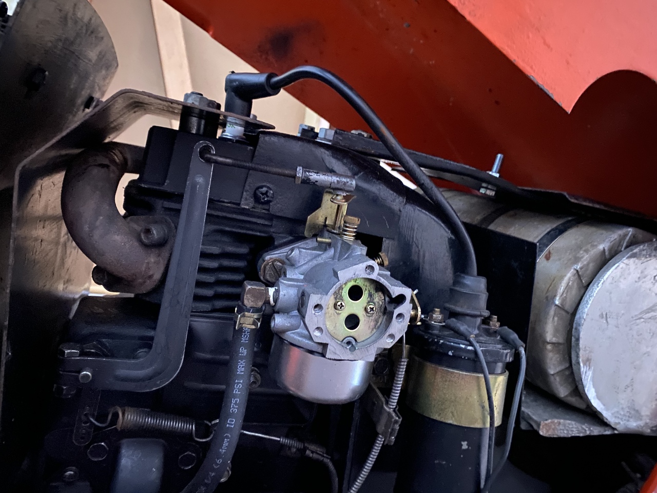 You have an issue that must be addressed. Your throttle linkage to the governor's arm should be parallel with the frame or ground. You have an angle that I have never seen before. I do know that you cannot have it that way. It is not going to ever work right like that. So, changing the choke shaft will not fix the issue of the throttle linkage to the carb being way wrong. I think you got an almost correct carb or something. Like I said I have never seen one that way before. But, the geometry of the linkage will prevent the engine from running correctly.Eugen wrote: ↑Fri Dec 17, 2021 12:08 pm After discussing this with Dave, and reading the original Lovejoy installation instructions, I think I got it figured out. Indeed, as @ssmewing says, an original spider may have the right spacing (also due to the piston like bumps on its to contact surfaces). The original installation instructions also specify the alignment tolerances, which I am thinking are a non issue if the pump housing is not bent, as the housing is what should supply the necessary on-axis alignment. So all there's left is the clearance, which I will change again.