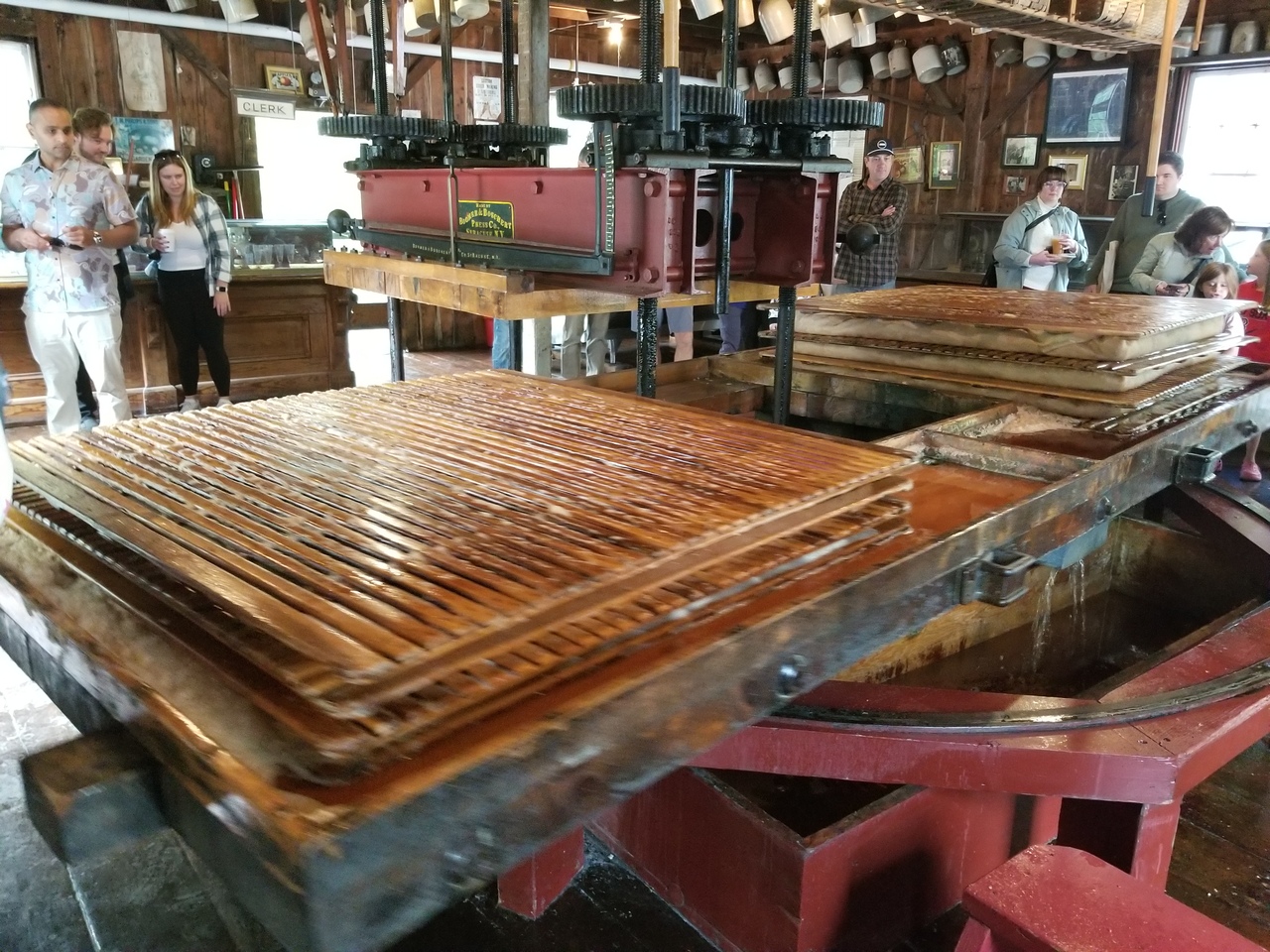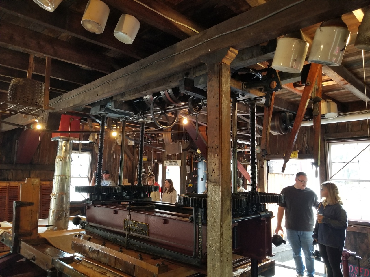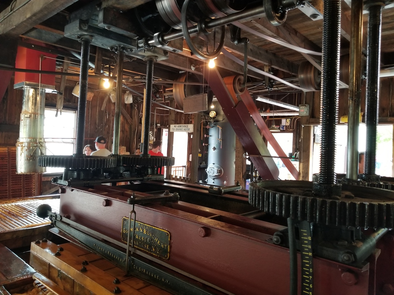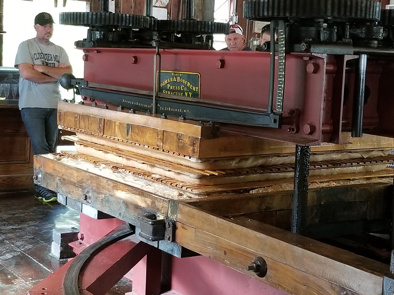 The apples come in off the truck on a conveyer belt to a steam powered grinder located upstairs. The ground apples come down a chute and are loaded into canvas sort of bags to be pressed between the wooden slats. Several layers are created and then pressed. The press control levers are on the right in the 4th photo. The steam whistle is good and loud.