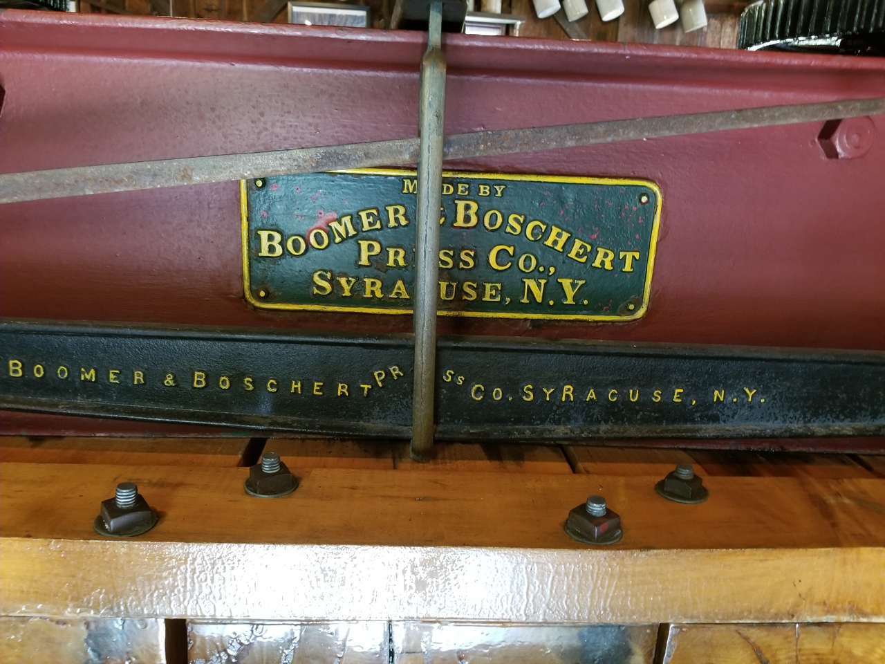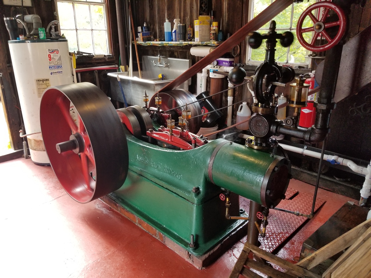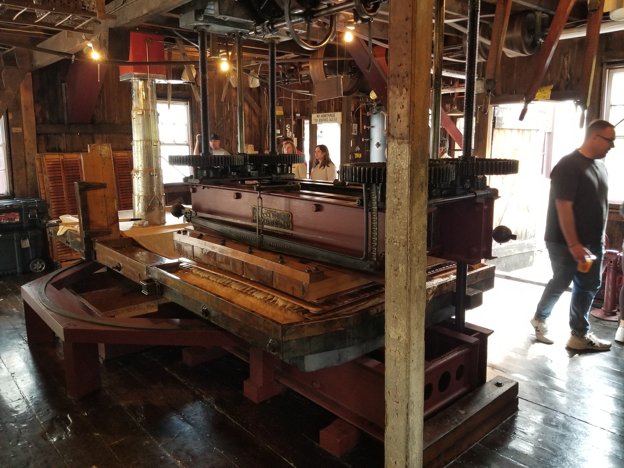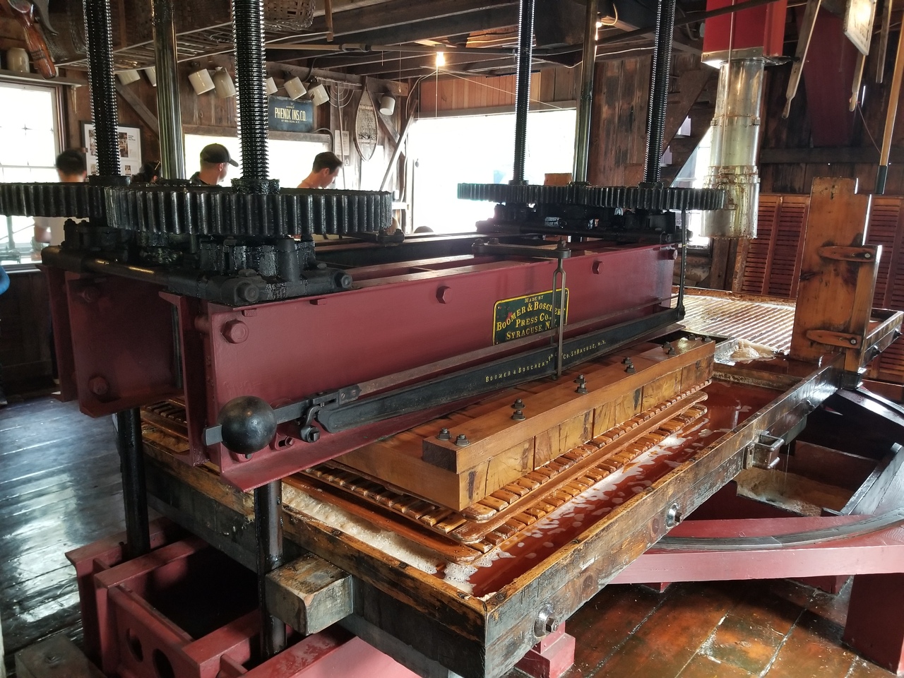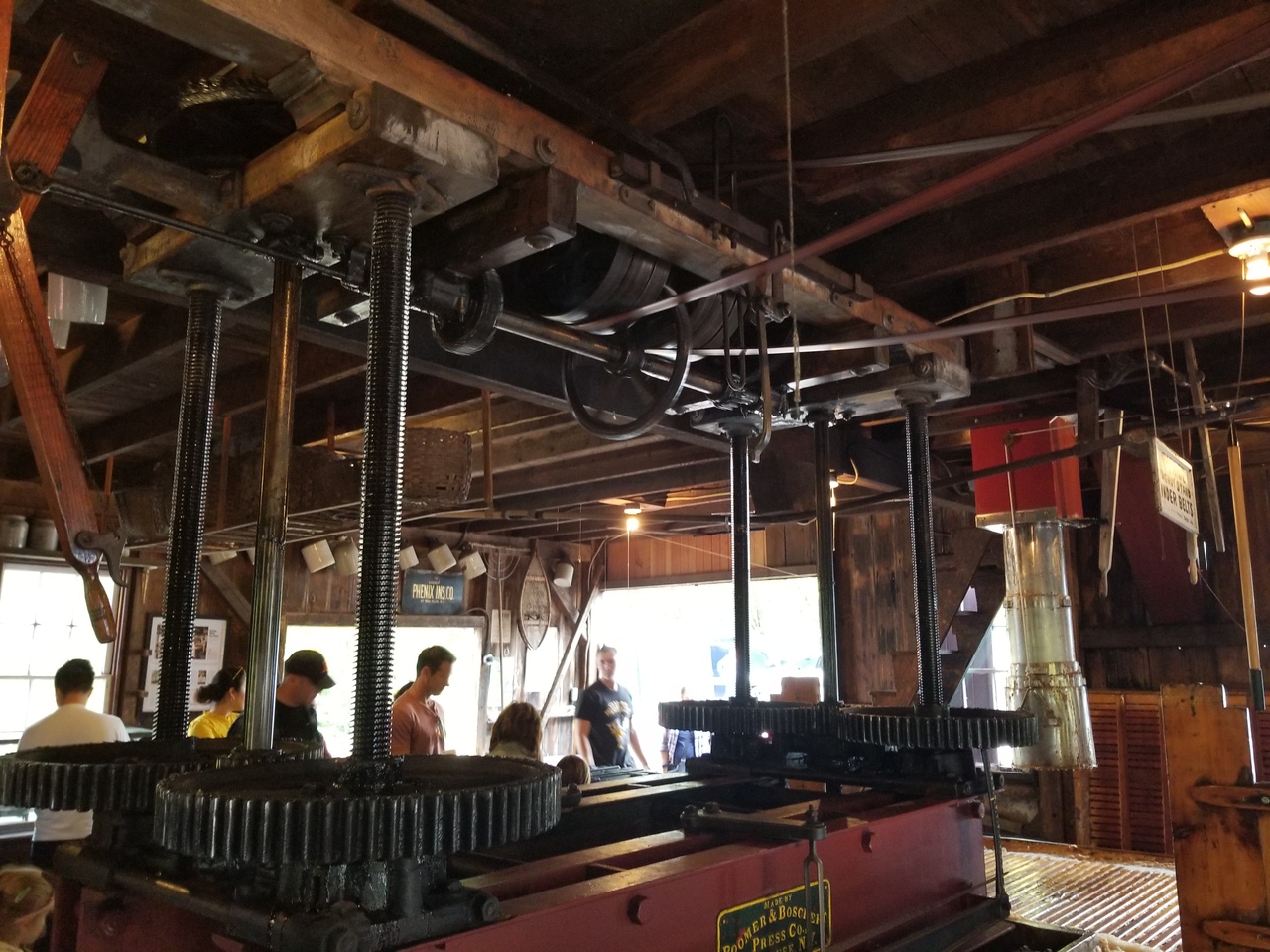 The apples come in off the truck on a conveyer belt to a steam powered grinder located upstairs. The ground apples come down a chute and are loaded into canvas sort of bags to be pressed between the wooden slats. Several layers are created and then pressed. The press control levers are on the right in the 4th photo. The steam whistle is good and loud.