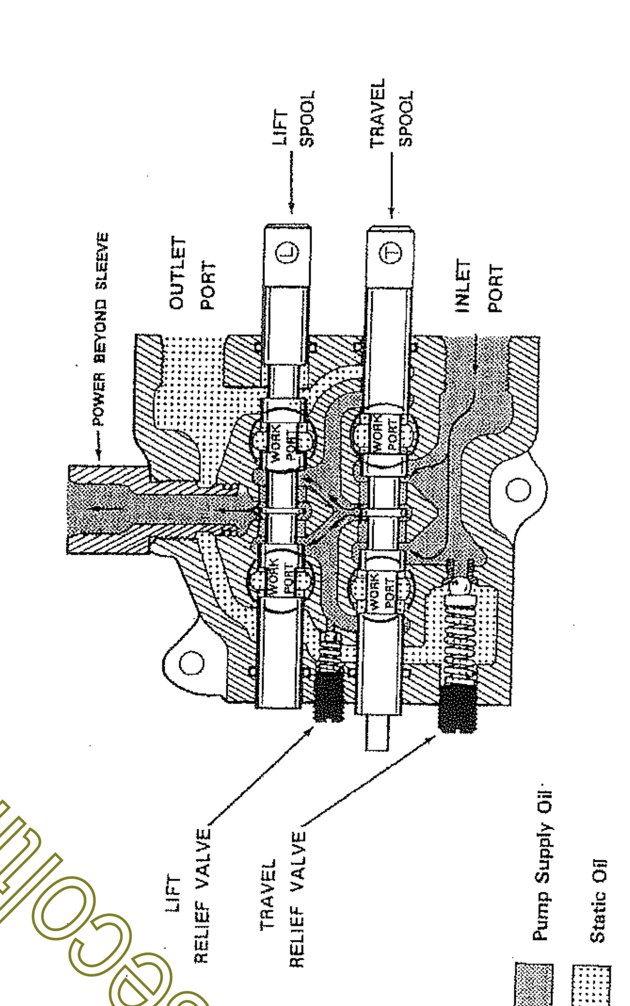 And what DID happen? Nothing. With either of the loader valves open, ZERO fluid passes on down to the TCV. It's completely isolated. Which makes sense if you really think about it. When I open one of the loader valves, it directs all the oil to the cylinder. If it left a passage open for oil to pass on downstream to the TCV, then the open center of the TCV would just let the oil flow right into the return line, leaving you with too little pressure to operate the loader cylinder. The loader valve HAS to isolate the power beyond port WHEN one of the valves is open.