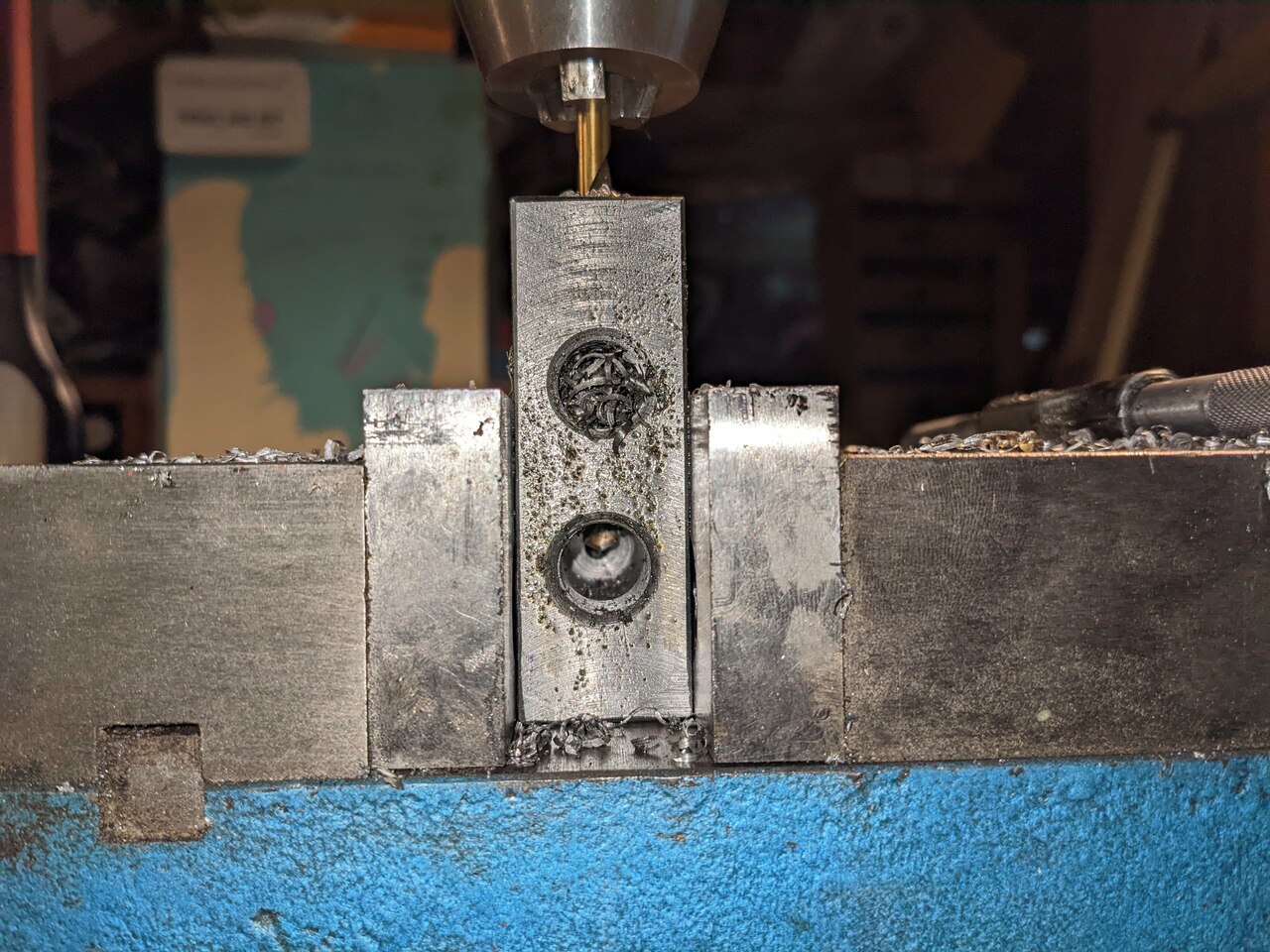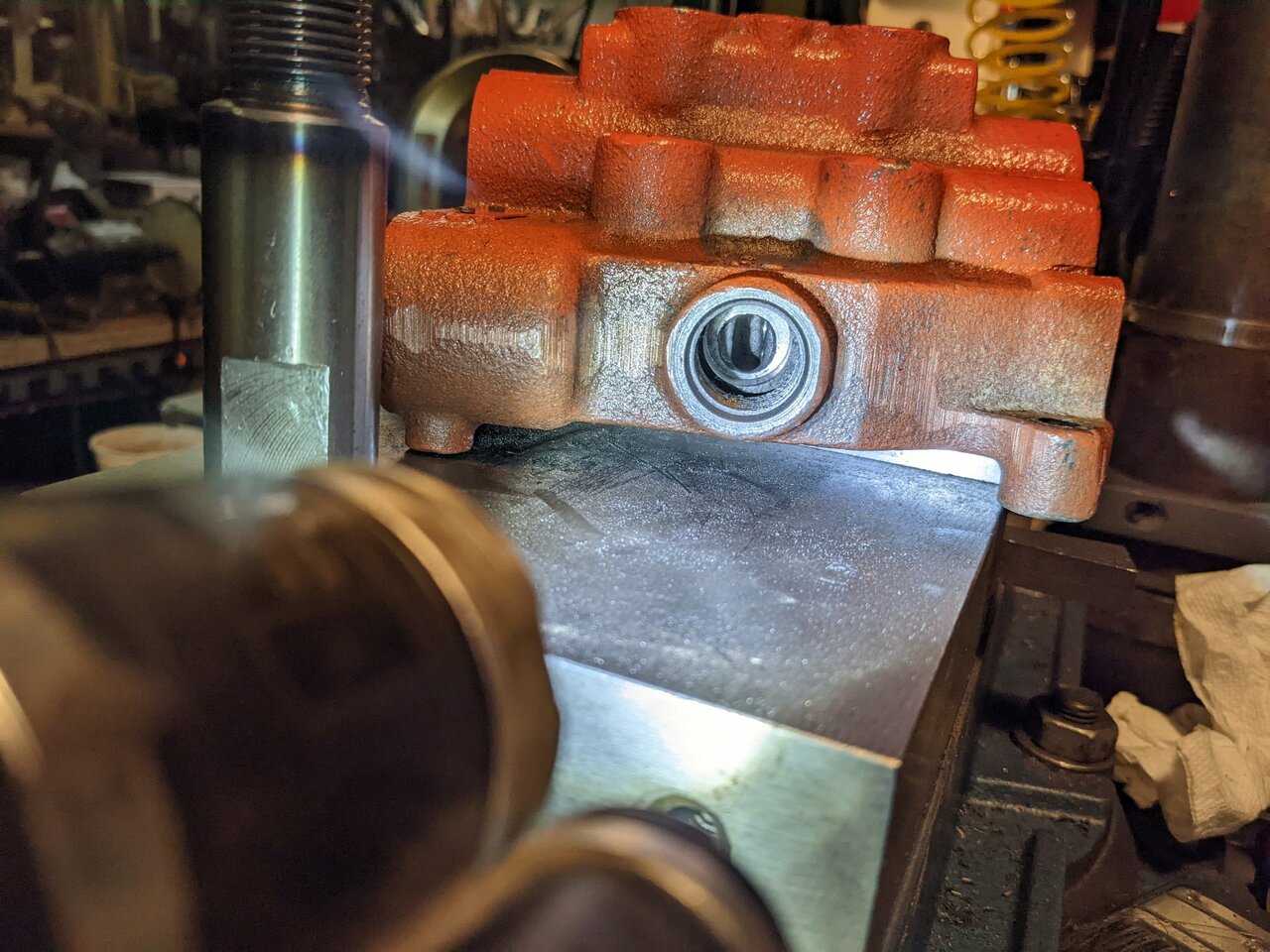 I measured the relief valve chamber of a spare TCV and drilled this as closely to those measurements as I could. About the only tricky part is the beveled lip down deep where the steel ball will have to seal against. I used a drillbit to create the hole, then ran the drillbit backwards in an attemp to kind of burnish it to a clean finish.