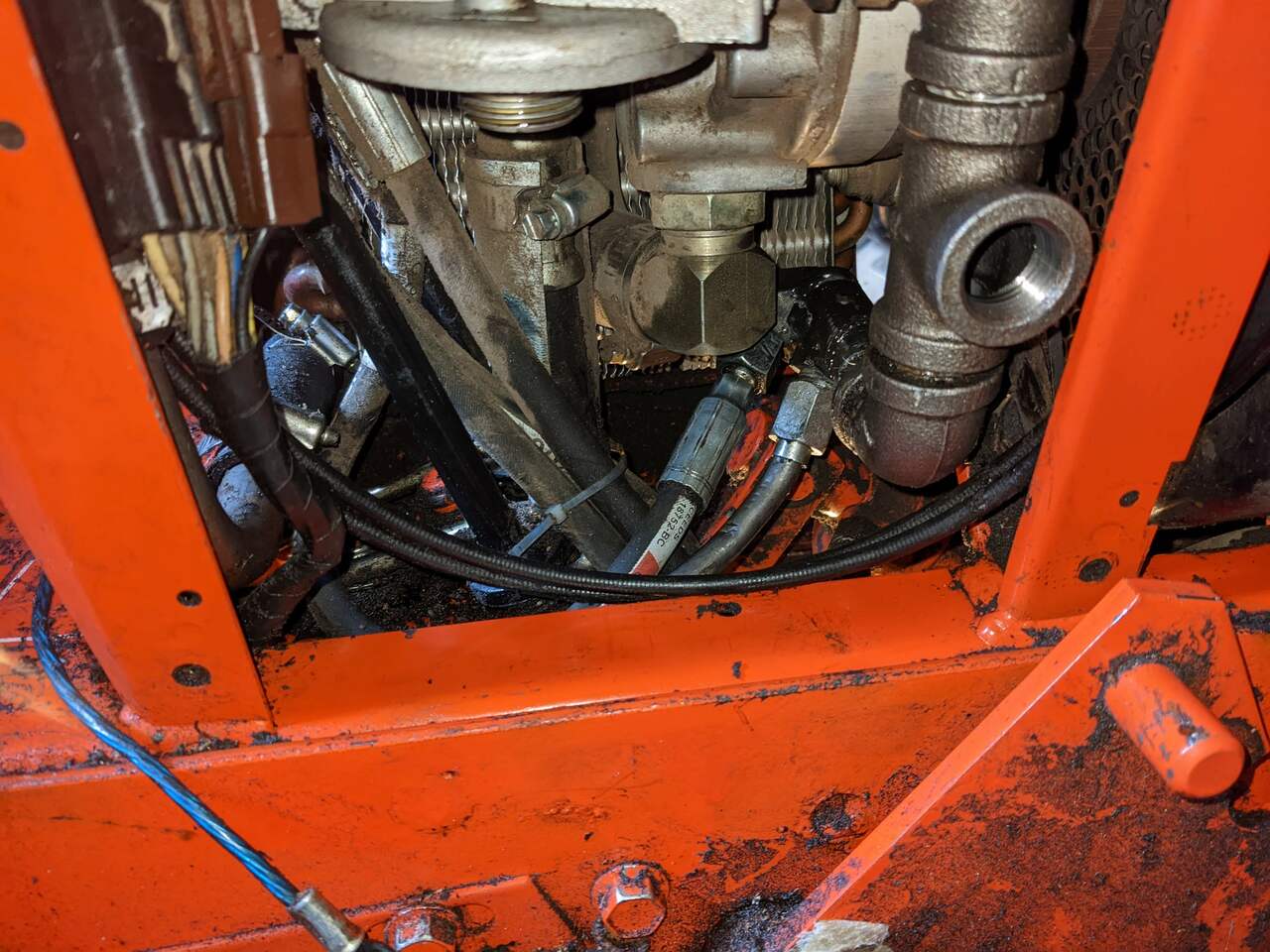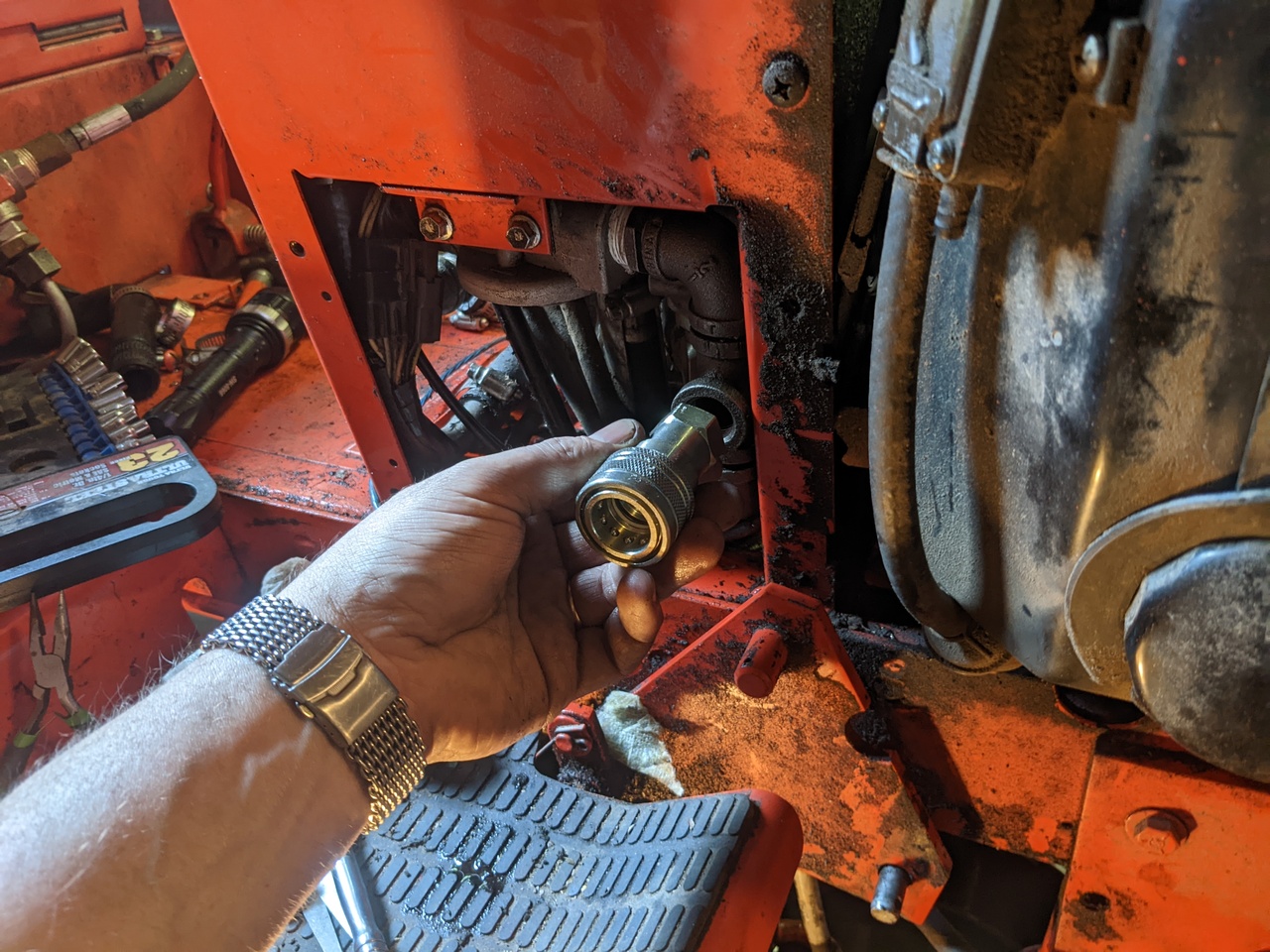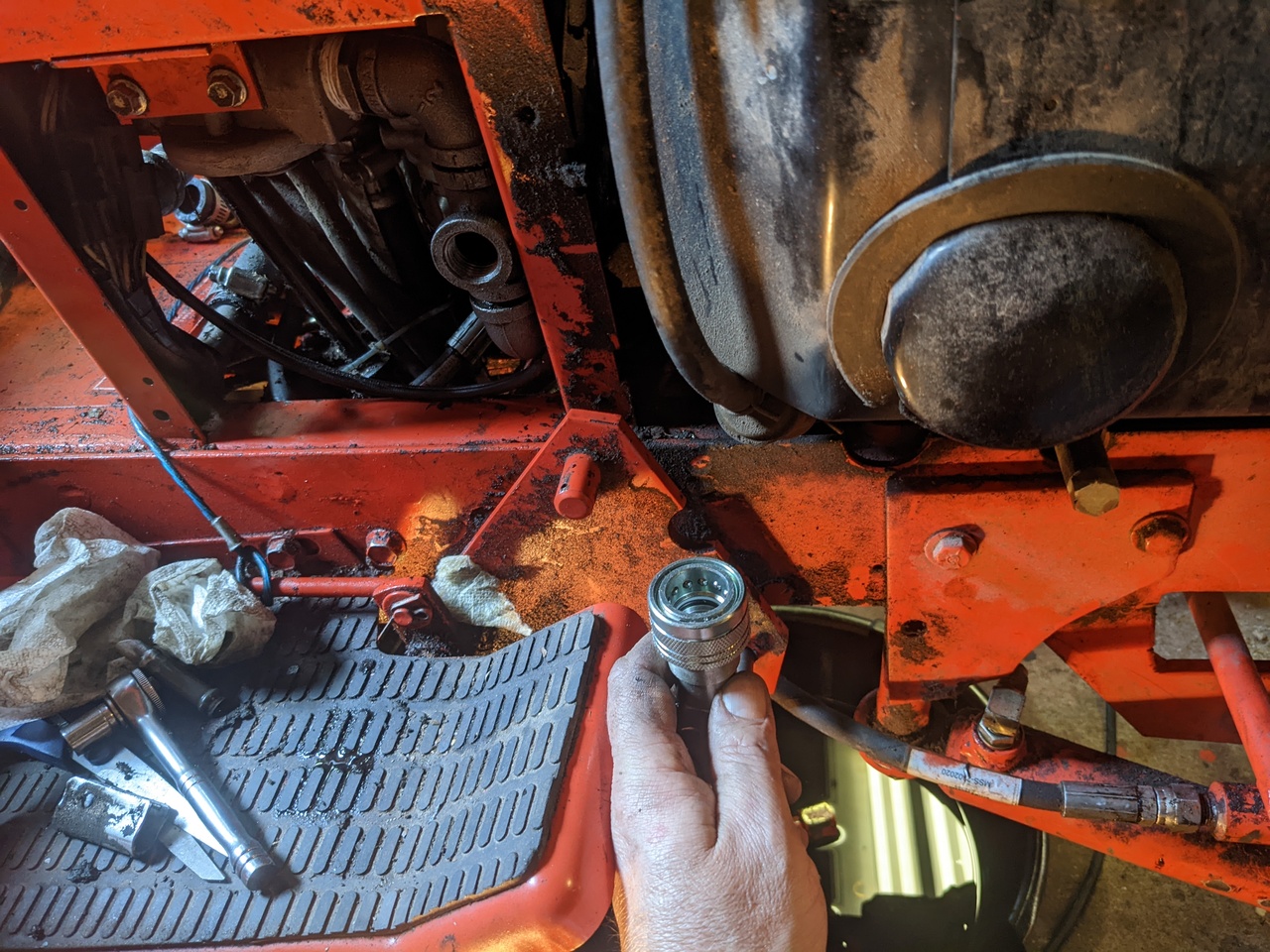 Crazy, right? Since I have the loader work ports looped from output right back to input (pull the lever and oil just flows harmlessly through the loopback hose), what if I started up the tractor and hauled on one of the loader valve levers and THEN TRIED THE TRAVEL LEVER to see what happens?