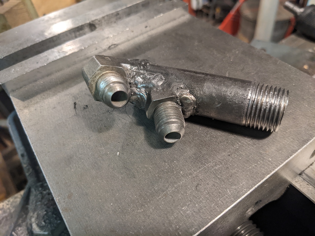 So I chucked up some 1" round bar and turned into a 4-way tee/mini manifold. It's just simple drilling and tapping.