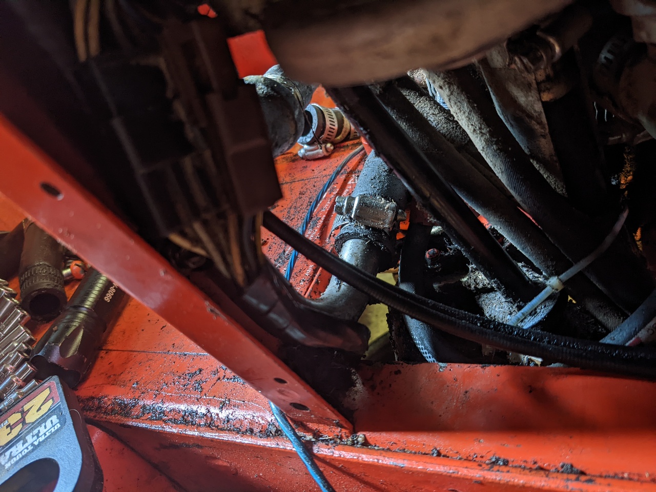 But there's a lot of fttings and lines running through that little space, no two ways about it. Here's a look up at the TCV with the camera under the deck/mid lift pointing back toward the transaxle.