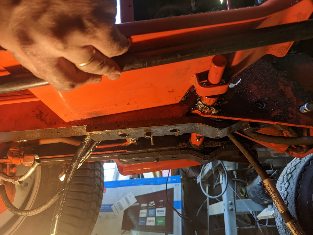 I made a mounting plate for it and bolted that plate up to the right hand frame rail, right behind the place where the loader cross-member will bolt in, and detached the power steering valve's return-to-tank hose from where it used to attach to the return-to-tank manifold right near the hydro oil filter, and routed that hose down and attached it to the new multi-function relief valve. Then I created a new 3/8 hard line that runs from the new multi-function valve up to the now open port on the return-to-tank manifold.