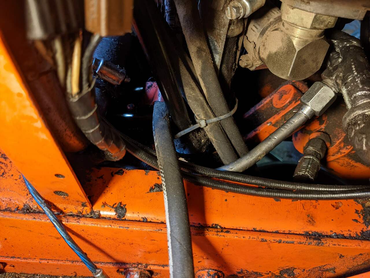 Meanwhile, I needed to install two new tees to connect from the work ports on the accessory lift over to the new relief valve. I put the first tee into the line that currently has a single output line, a line that leads up to the selector valve. That tee went in without too much drama, though I had to do some creative bending to get the 3/8" hard lines bent/squeezed/looped in the tight space. 5/16" tubing is a lot easier to work with, but JIC 5 fittings are expensive and hard to find, so I just went with JIC6 and 3/8" tube.