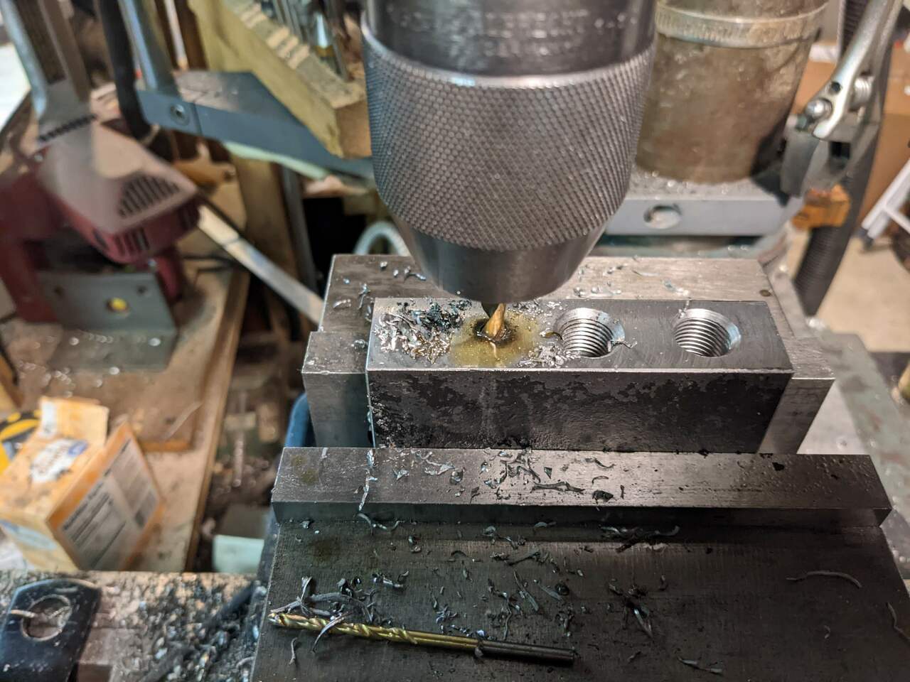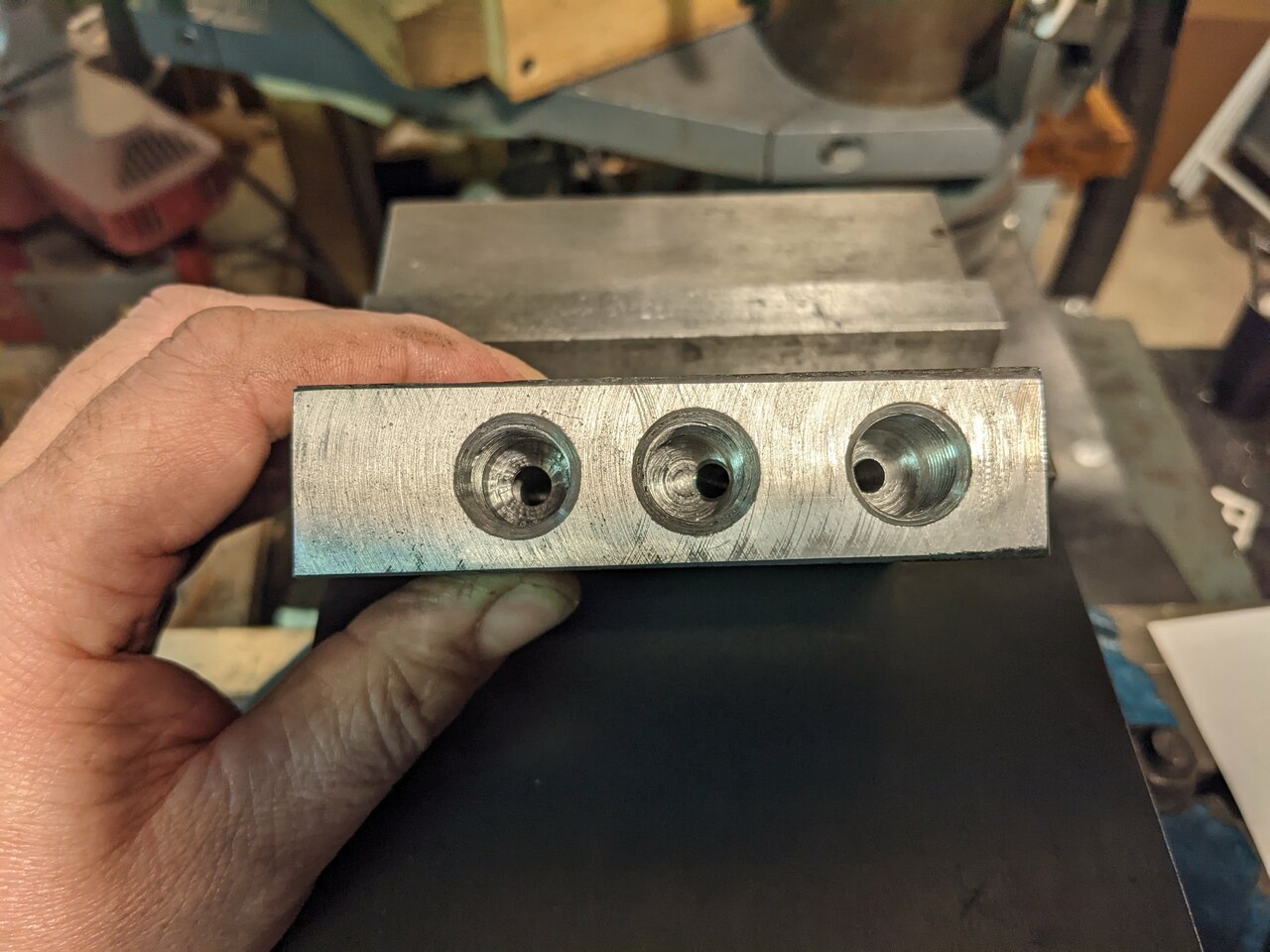 Next I drilled one of the outlet holes, and tapped and beveled it for SAE #6 Female. Then I drilled its deep passage that reaches all the way into the relief valve chamber. I wanted to pressure test the relief valve, and I needed this hole to be in place, so that my pressure test air had a place to escape.