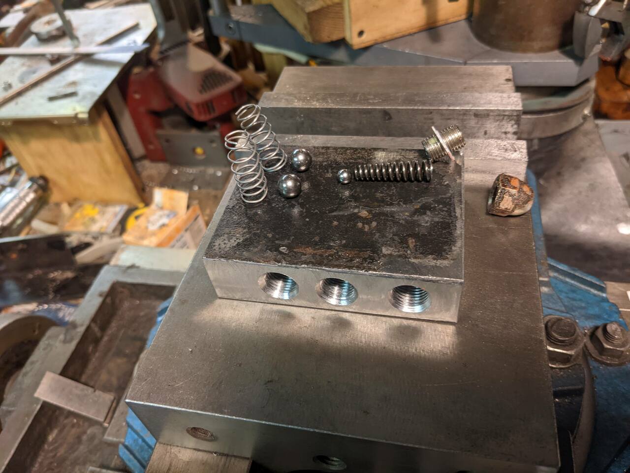 I took the time to wind a couple of 1/2" OD springs using .038 music wire. These are what will drive the check ball. Being hand-wound, they're ugly, but they're strong enough to overcome the viscosity of oil, while being weak enough to easily allow fluid inflow at around 30psi or so. So they should work fine.