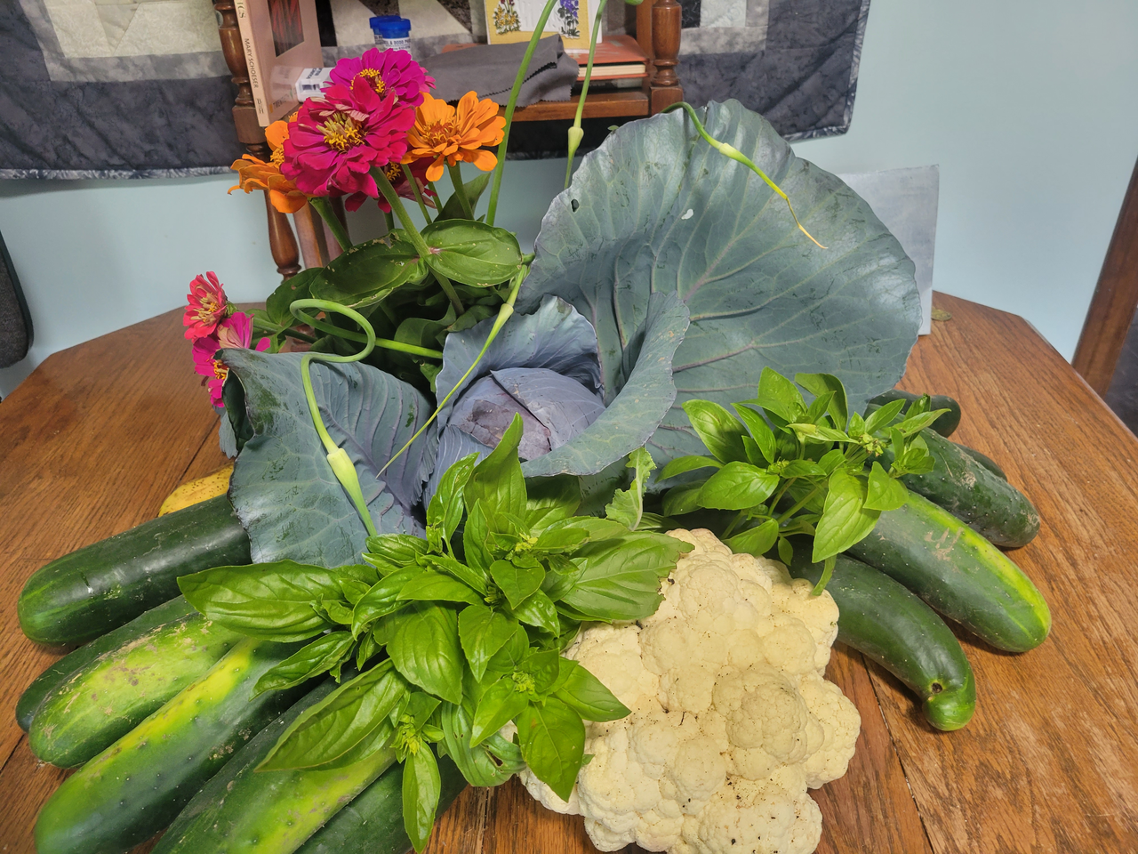 M is an artist and loves pretty colors. I know how to sneak a bunch of cucumbers into the house when offered cabbage, broccoli, bassel, and a few cut flowers,