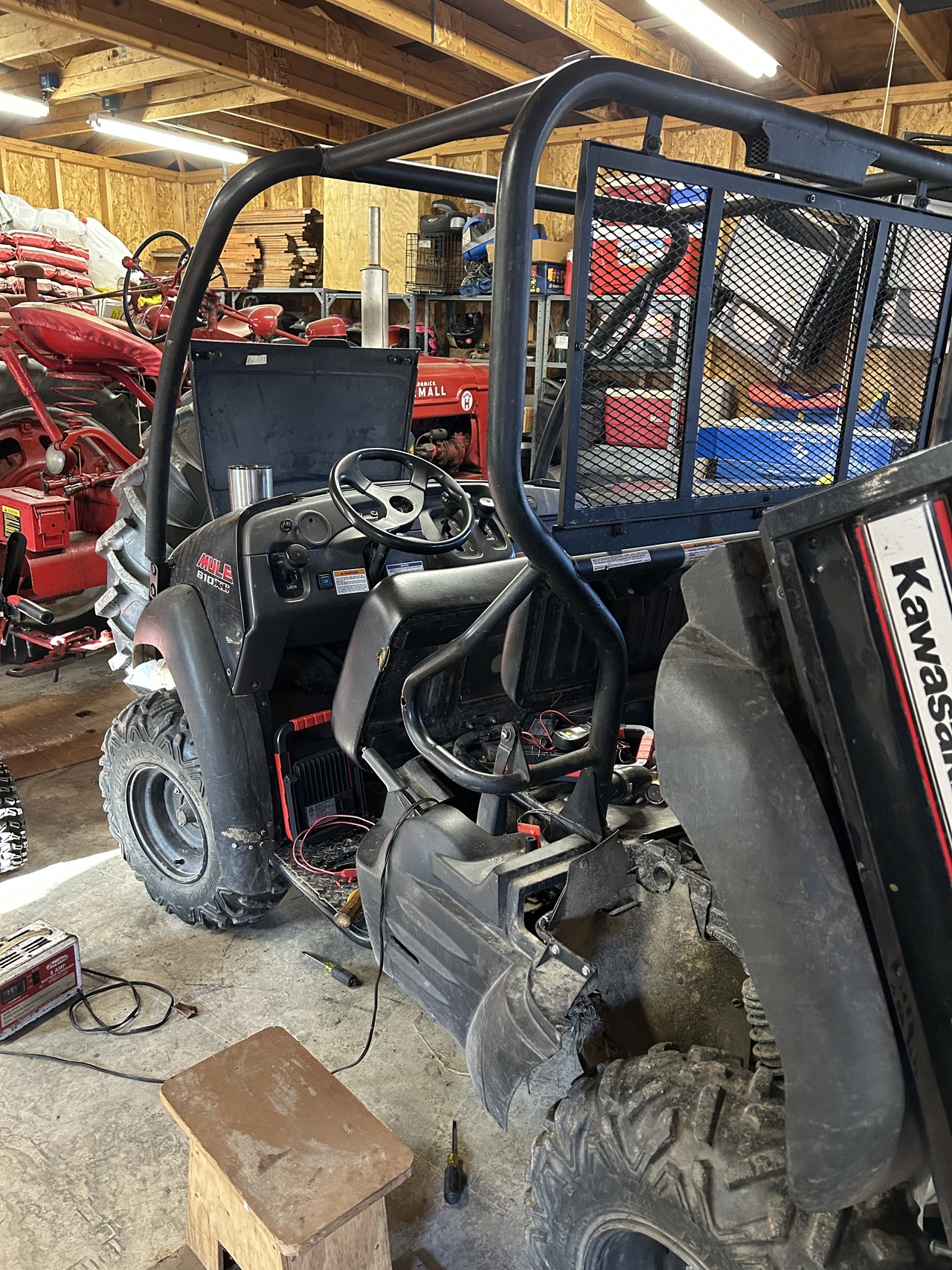 Today’s shenanigans were on our Kawasaki Mule. The new battery I just put in it is dead. I put a meter on it last week and it’s not charging. Like most of the machines we have around the place this one did not run when we got it. It had an electrical fire so when I got it home I fixed all the wiring and it’s been a great machine for at least 5 years now.