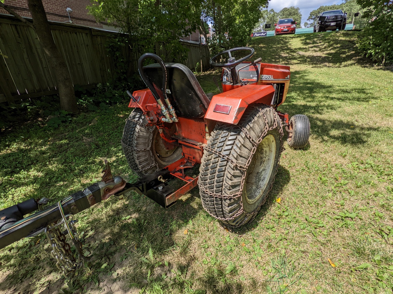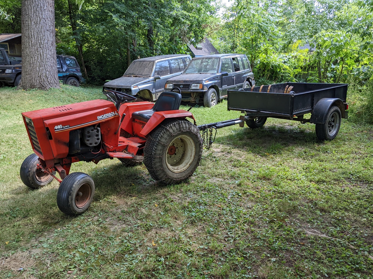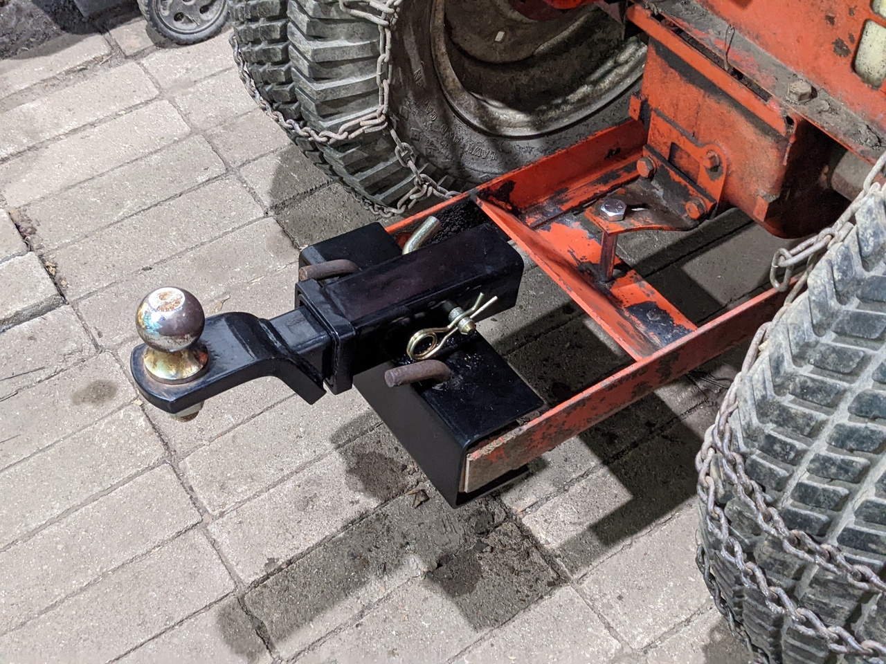 The 446 is intended to be used up north on our wooded 10 acre property. We are going to build a home up there this summer... once major construction is done there will be firewood to haul, a garden plot to make and lots of trails to run through the forest. Most of the attachments went to the property last summer as they were cleaned up and refurbished, I kept the blade and the snowcaster back, hoping to use them this winter - last summer I wanted to use the tractor for moving stuff around the yard so I fabricated a 2" receiver tube adapter for the sleeve hitch...