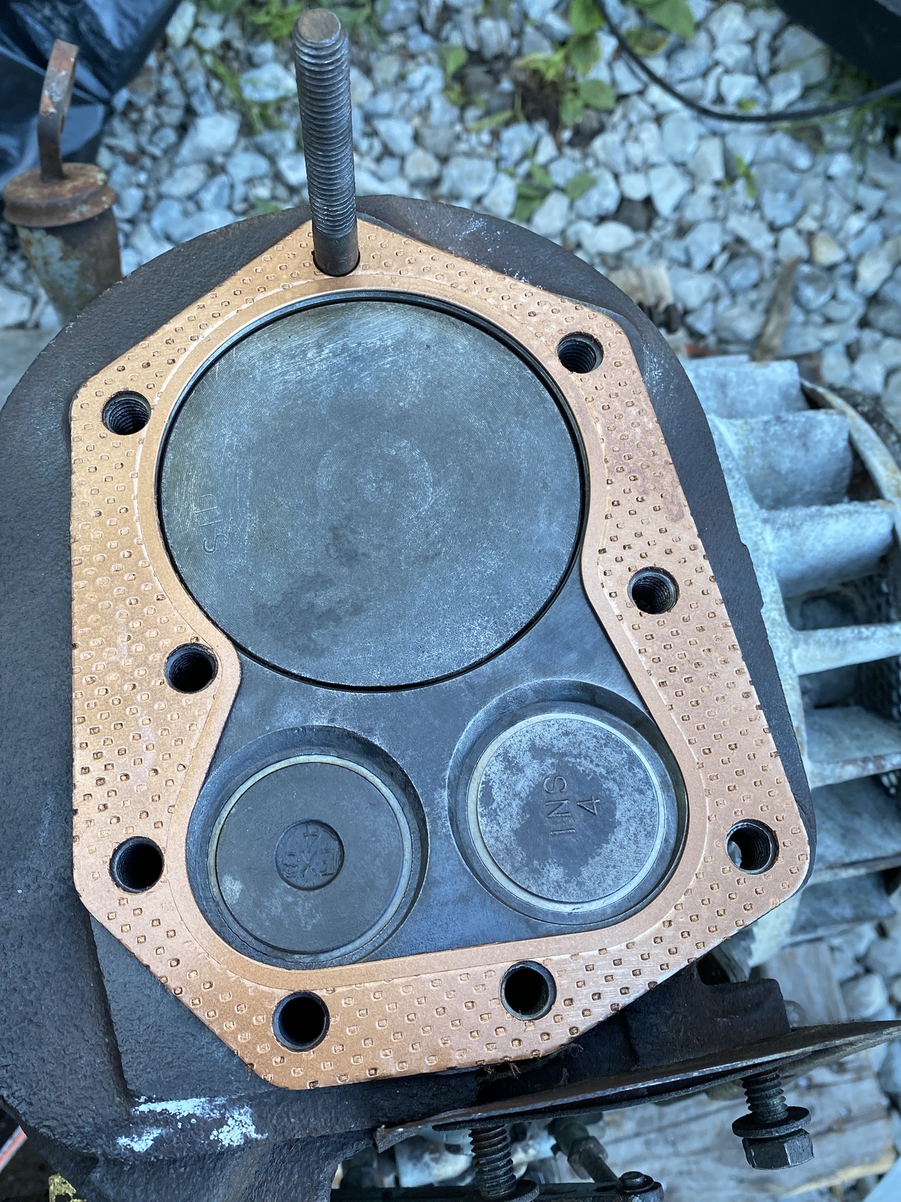 Fast forward to a week ago when I decided to put the 644 engine in the 224 mower. But hey, first snag was oil pan. That was not originally an engine from a Case tractor, most likely a JD. The belly pan of this did not fit the 224. Then :idea:! get the oil pan from the seized 444. Fine, engine out, oil out, belly pan off. While fooling around with the "seized" k321, to my surprise, the crankshaft turned! :O Surely, I thought, it's a miracle. But no use in getting my hopes up, the engine could still be bad. Being on what I thought was a clear trajectory I continued with the JD engine only to hit another wall. The pto shaft of the 444 engine did not fit the flywheel of the JD engine. The four mounting screws are about 1/8 further from the center. You all probably saw this coming from the beginning but I didn't. Sure I could make it work but the idea that maybe the no longer seized engine is actually fine so let's check it out. A simple task since the head was off because I tried to use it for something.