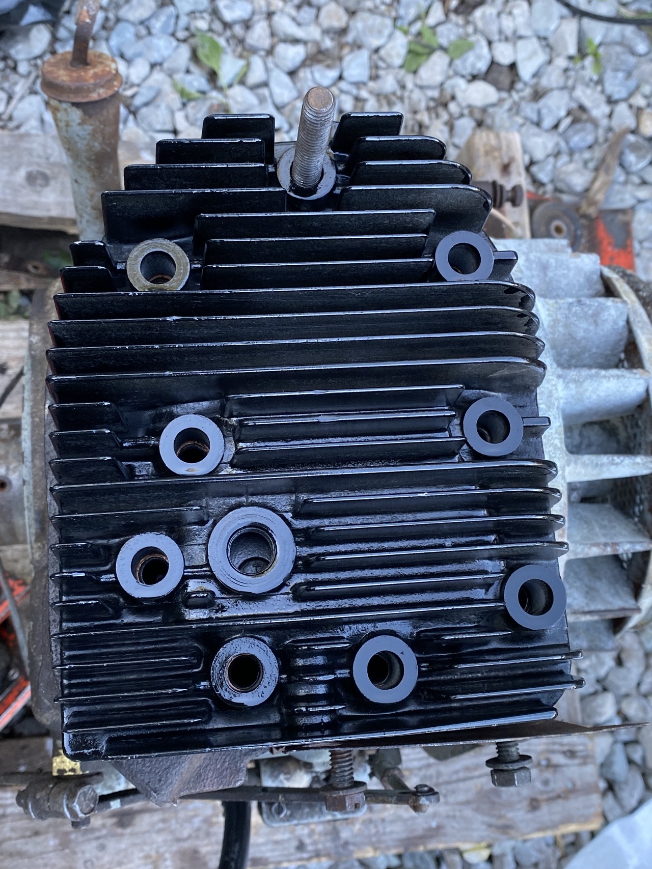 Adjust valves clearance, put the head on and torque, install new points, clean block and de-rust and some engine paint.