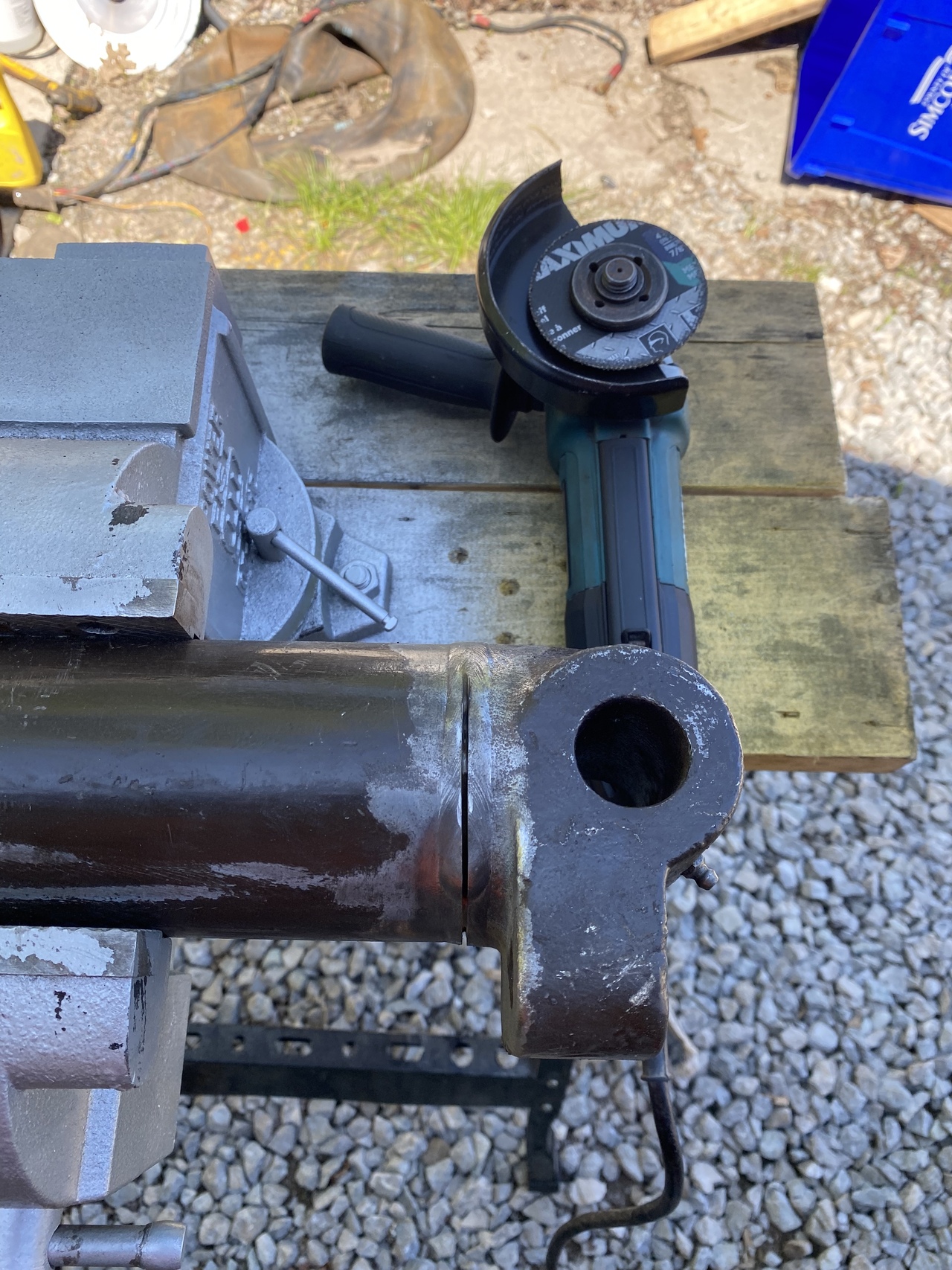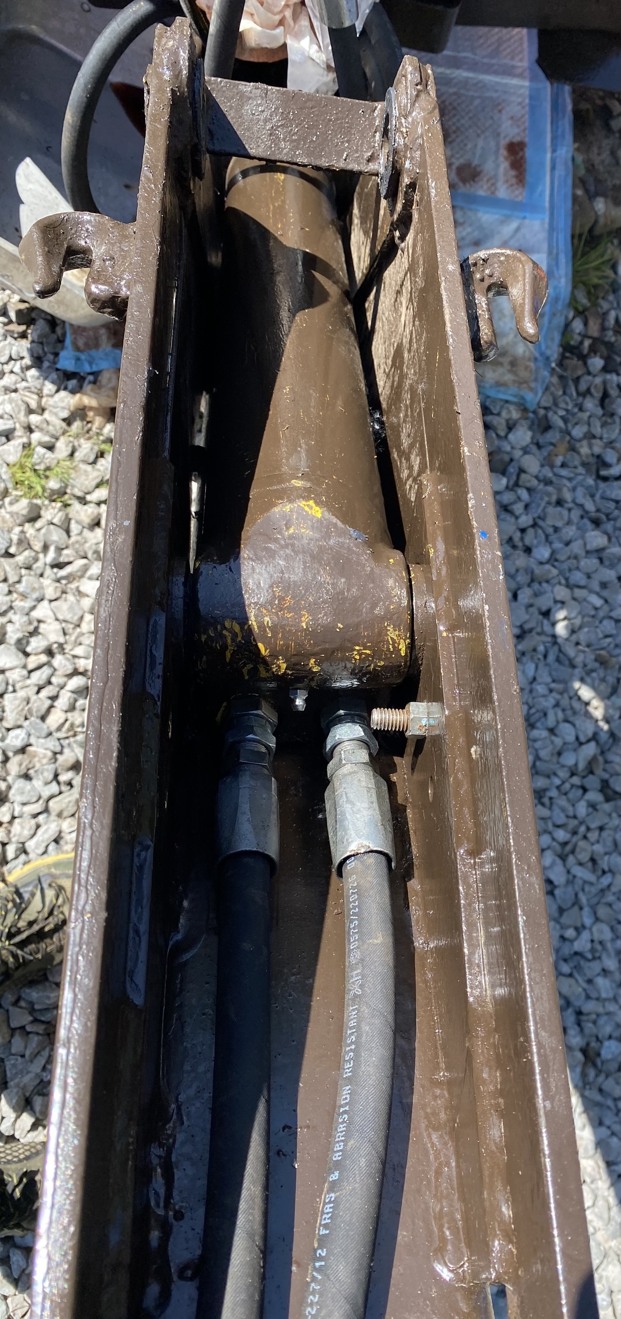 yet, for some reason, I installed it with those connections upwards. The dipper cylinder gets installed on top of the boom cylinder. The net result was that when the backhoe arm goes straight, that is, when the dipper cylinder extends, the big bump on the upper side of the boom cylinder stops the dipper cylinder from moving downwards. As I briefly tested extending the backhoe arm, the dipper cylinder extended and bent the rod, not being able to move downwards. Not cluing in fast enough, I retracted it. But then, realizing this was the case, I extended it again so I can have it in position to pull the bent rod out to fix it. But the bent rod in itself isn't the major setback. The real problem is that the bent rod pushed the piston into the side of the barrel so hard that now there's a big gouge, about 3" long and 3/4" wide at the bottom. Pretty deep by the looks of it.