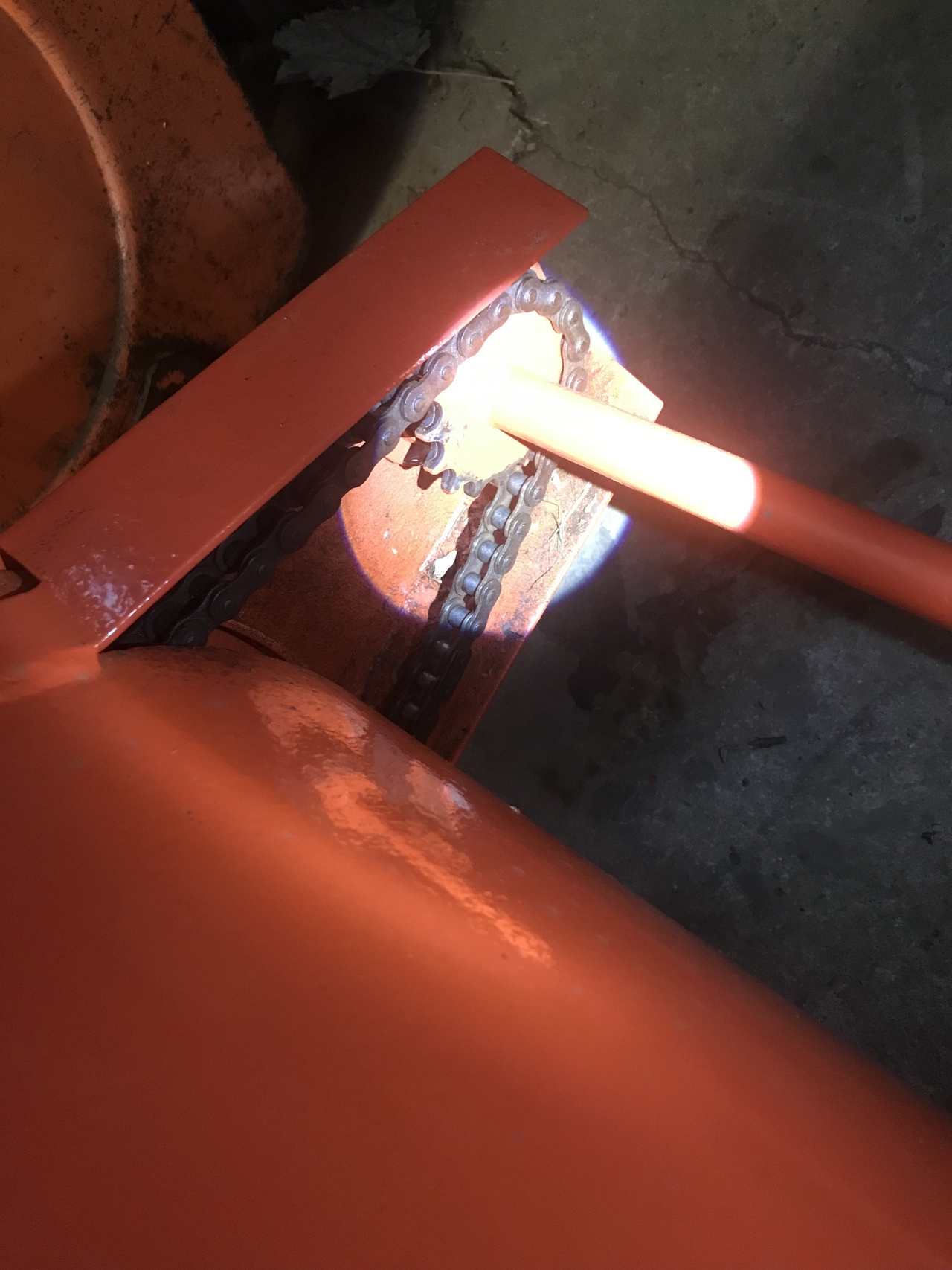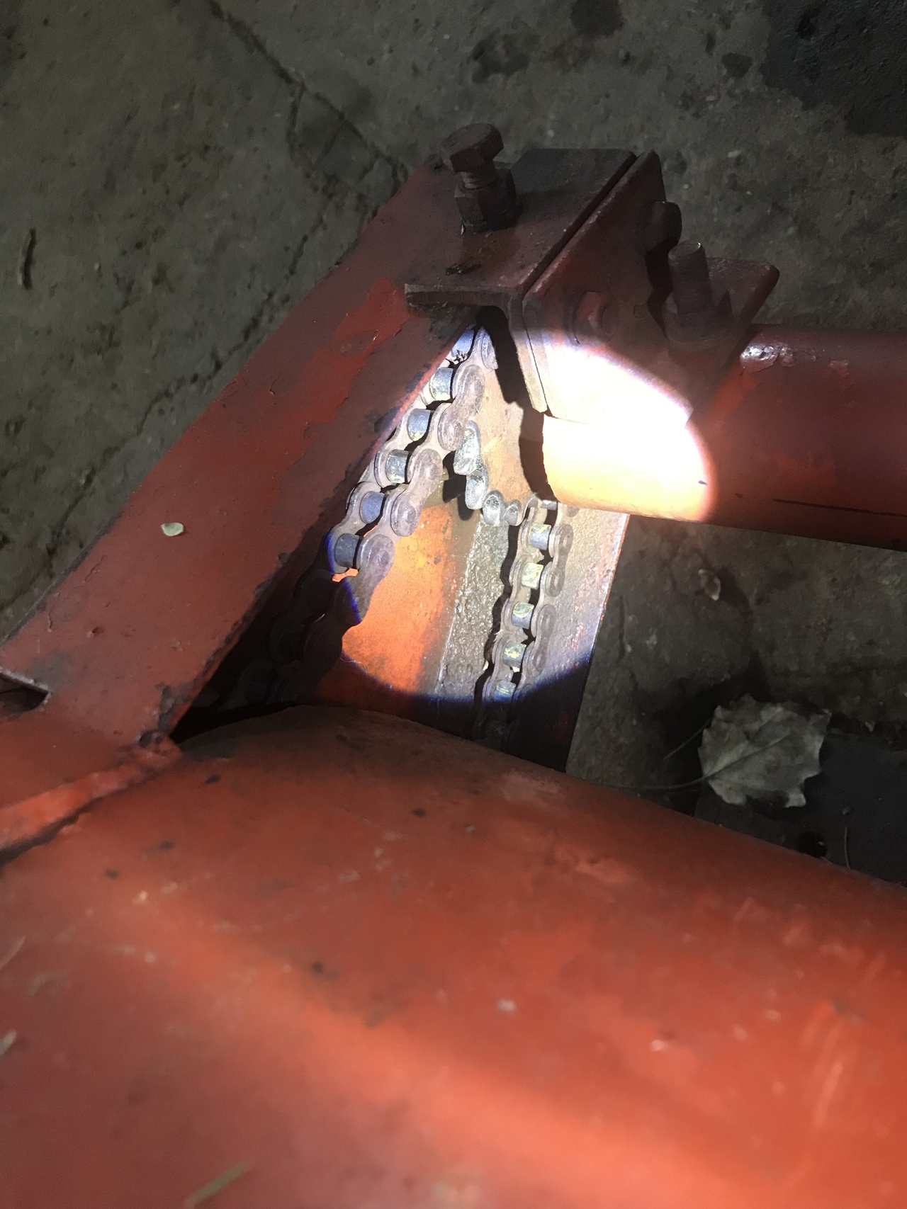 Changes made since this was taken are additional front end weights, wheel spacers to stop tire chains from slapping fenders, which is what is causing the click sound, directional control motor for shoot, travel speed control upgrades. Ground speed needs to be reduced to a creep to maintain adequate throwing distance.