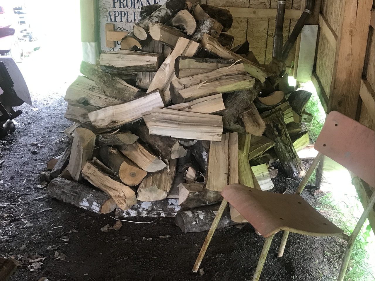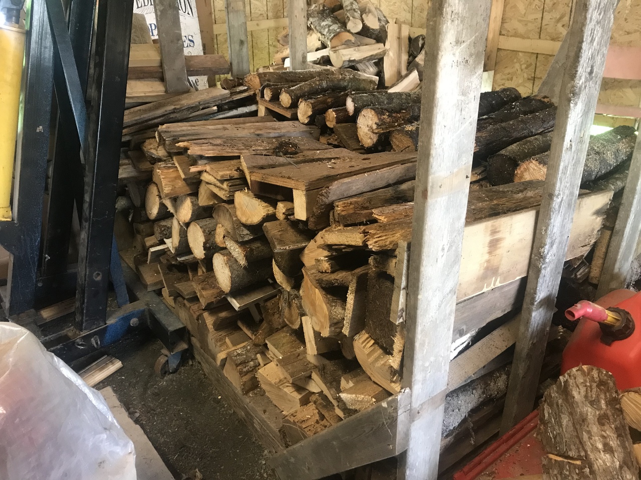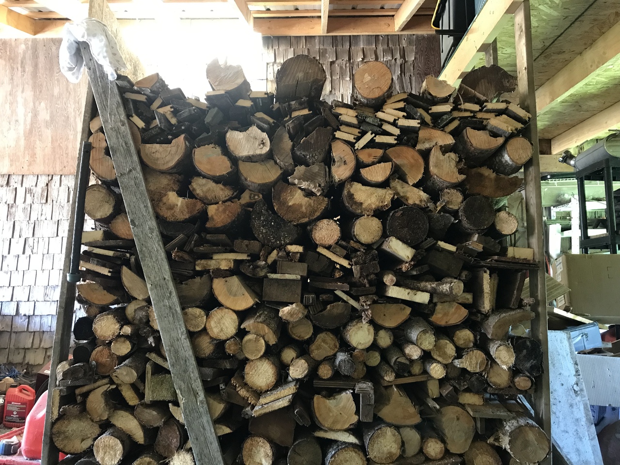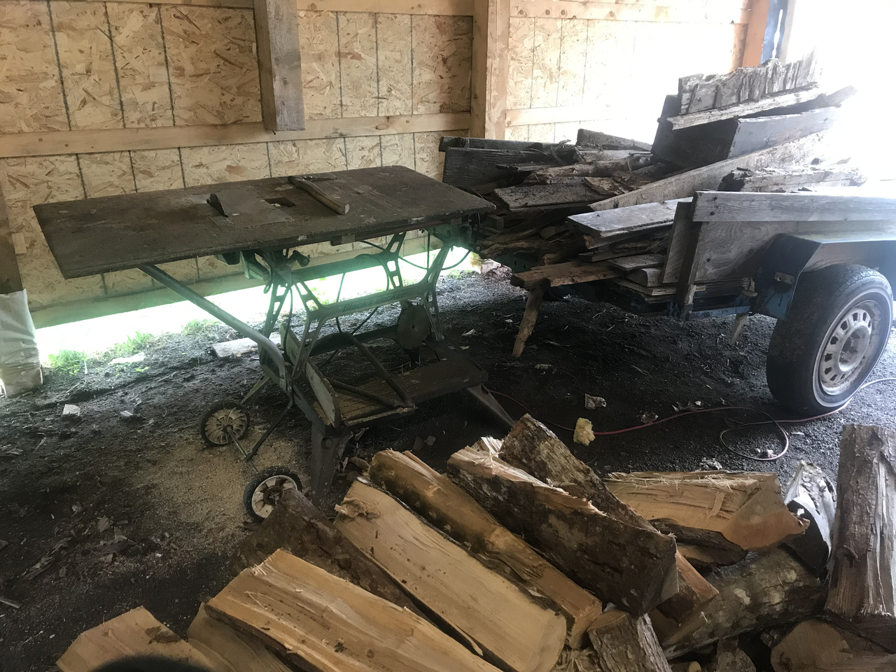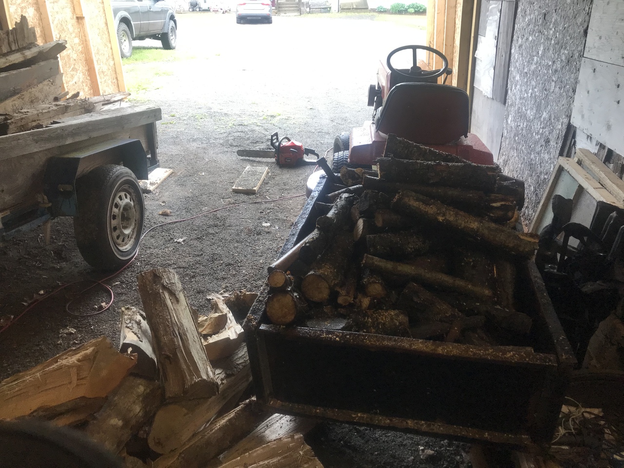 So was at this yesterday and today. Great spot to work in the lean too and have the doors open at each end, while it’s raining out. Son doesn’t want all hardwood in for the garage any more. He only burnt about a 1/4 of the pile there in the last two years. So I sorted the hardwood that was there into two piles. One 18” and shorter, that will go to the house for this winter. Any thing longer into the pile that will stay to burn in the garage. So I’m cutting up old boards and junk, with my dads home made table saw, and I’m out in the rain cutting up free softwood we got a few years ago and I’m making up sort of a Dagwood sandwich of wood. Hardwood layer, cut up board layer and soft wood layer, then keep going with that until space is full. I may run out of long pieces of hardwood before the end, but that’s ok. And I have my homemade pickaroons with me for help. Why I never made those many years ago is beyond me. They are a great tool for firewood. And other jobs too!