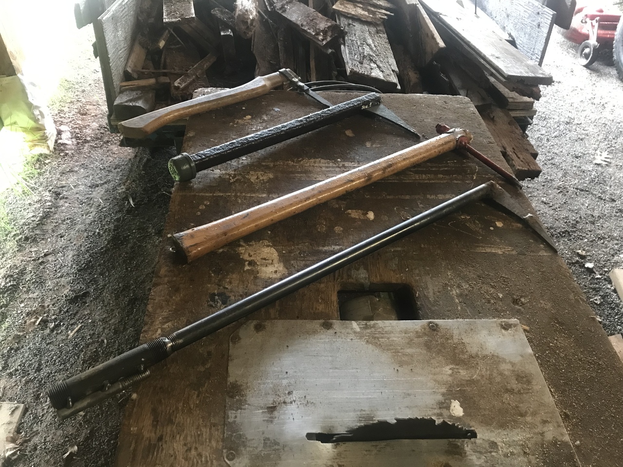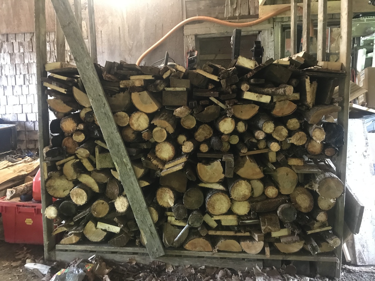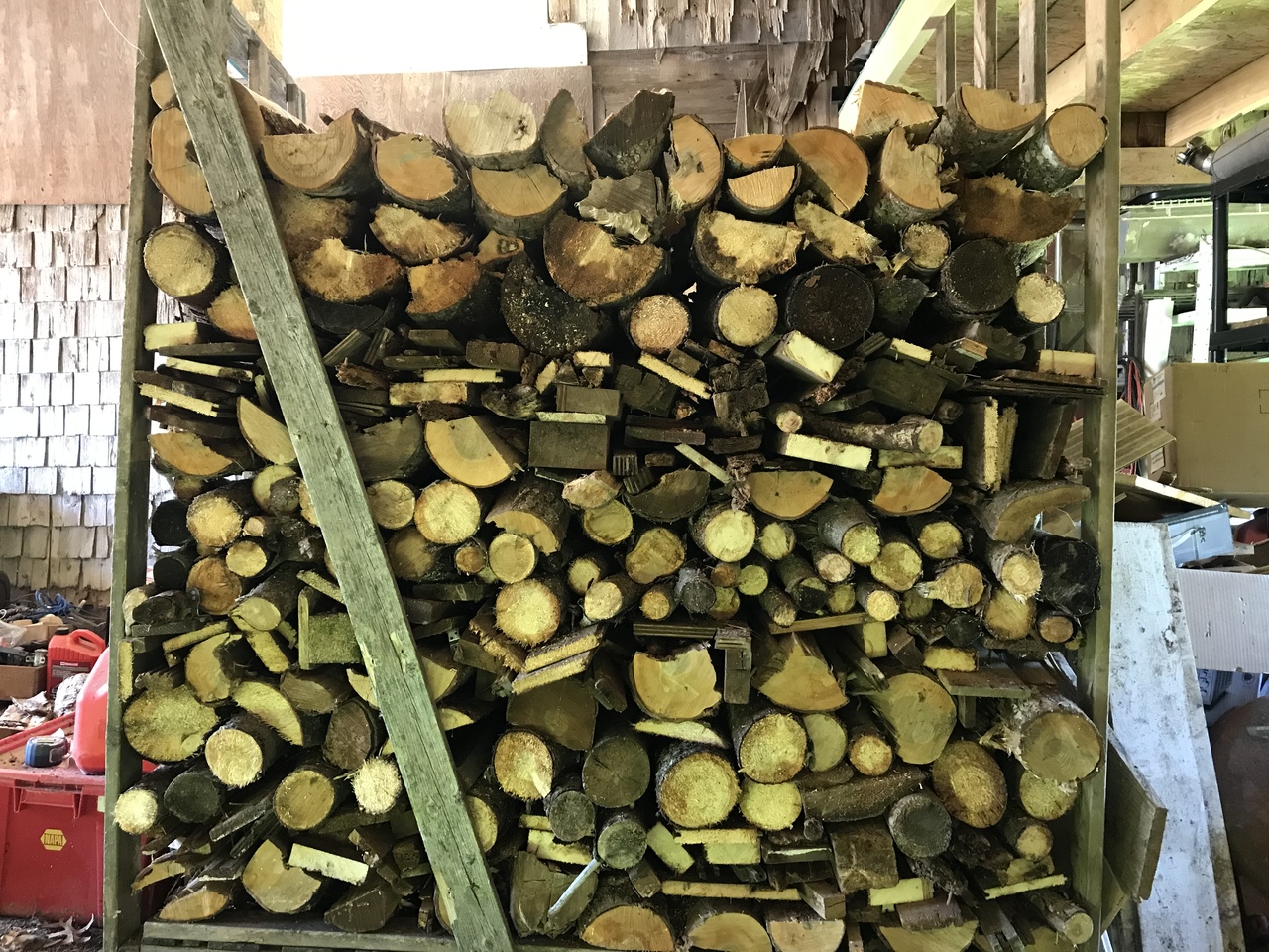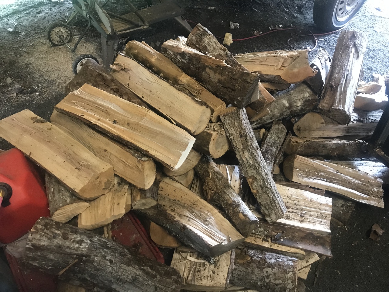 So was at this yesterday and today. Great spot to work in the lean too and have the doors open at each end, while it’s raining out. Son doesn’t want all hardwood in for the garage any more. He only burnt about a 1/4 of the pile there in the last two years. So I sorted the hardwood that was there into two piles. One 18” and shorter, that will go to the house for this winter. Any thing longer into the pile that will stay to burn in the garage. So I’m cutting up old boards and junk, with my dads home made table saw, and I’m out in the rain cutting up free softwood we got a few years ago and I’m making up sort of a Dagwood sandwich of wood. Hardwood layer, cut up board layer and soft wood layer, then keep going with that until space is full. I may run out of long pieces of hardwood before the end, but that’s ok. And I have my homemade pickaroons with me for help. Why I never made those many years ago is beyond me. They are a great tool for firewood. And other jobs too!