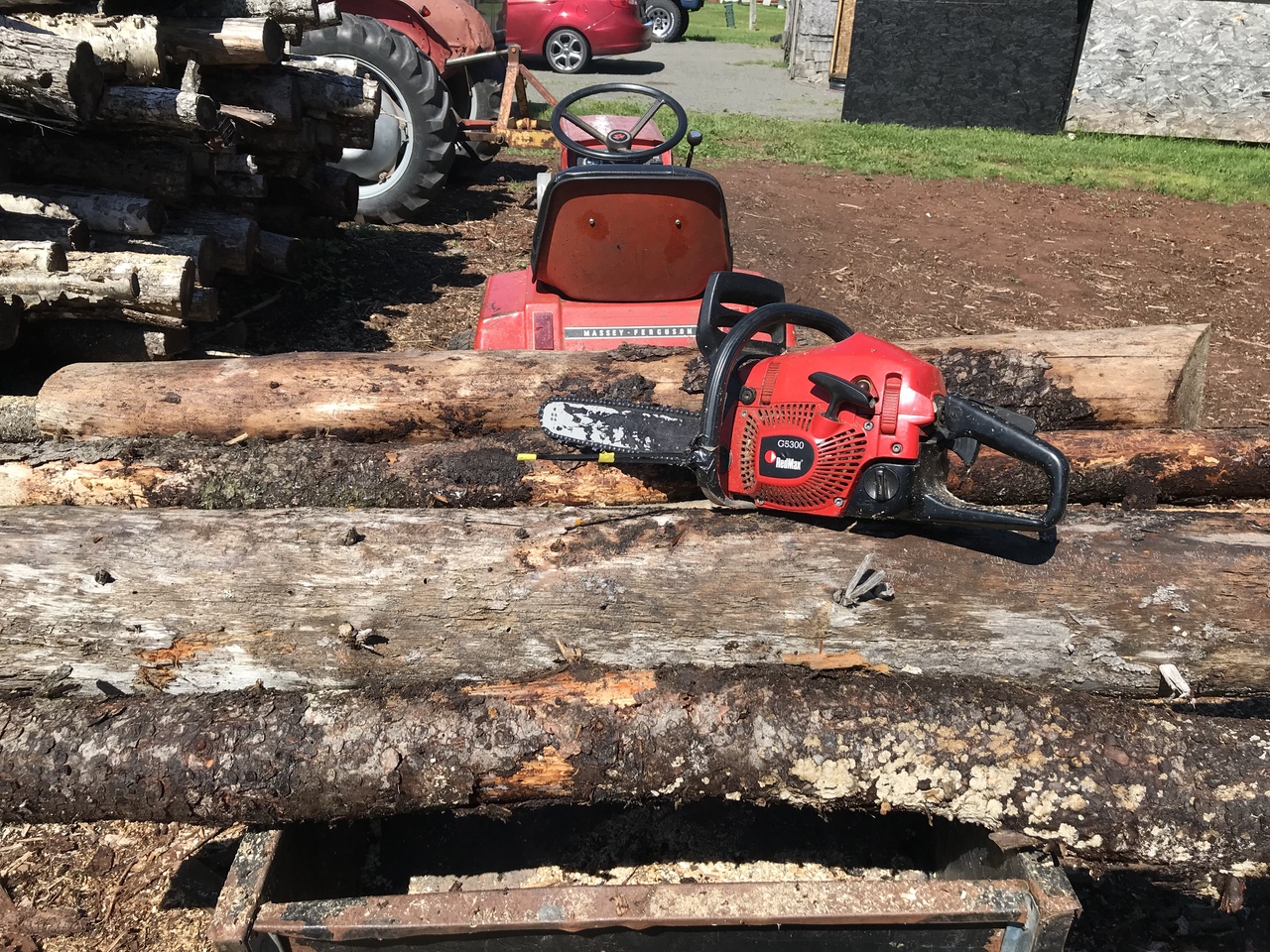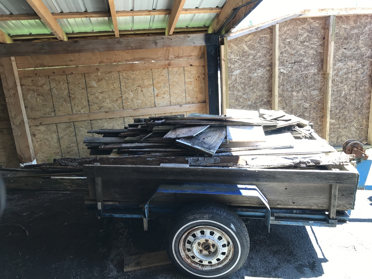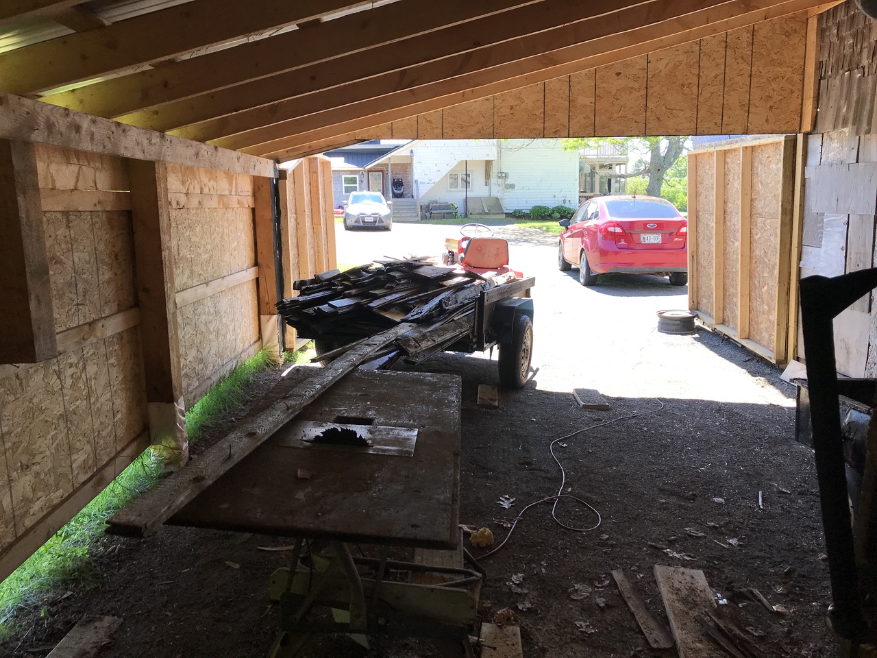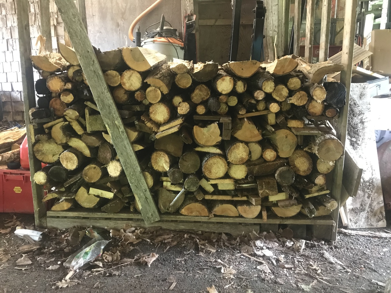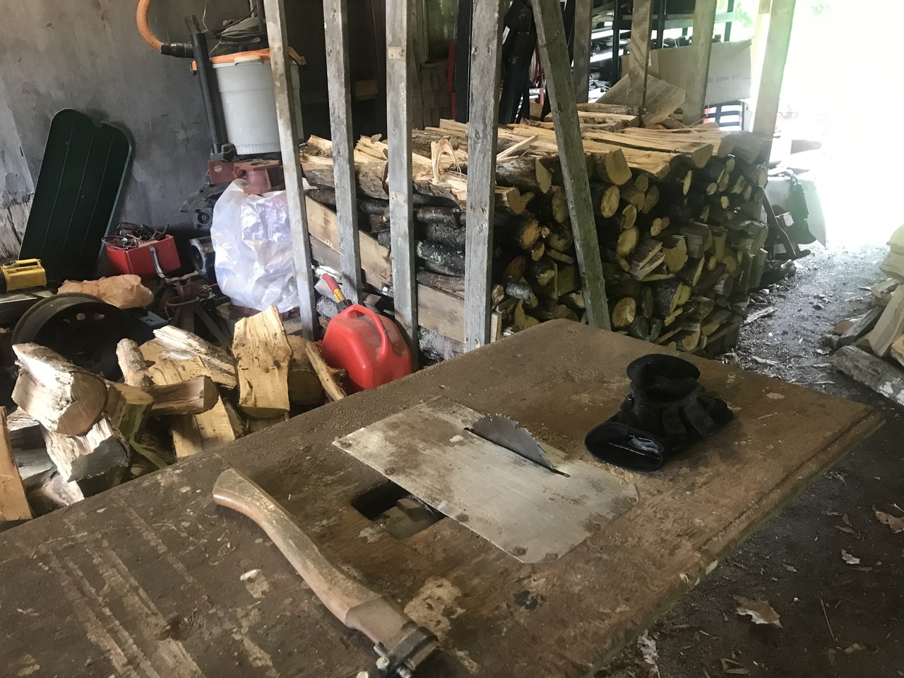 So was at this yesterday and today. Great spot to work in the lean too and have the doors open at each end, while it’s raining out. Son doesn’t want all hardwood in for the garage any more. He only burnt about a 1/4 of the pile there in the last two years. So I sorted the hardwood that was there into two piles. One 18” and shorter, that will go to the house for this winter. Any thing longer into the pile that will stay to burn in the garage. So I’m cutting up old boards and junk, with my dads home made table saw, and I’m out in the rain cutting up free softwood we got a few years ago and I’m making up sort of a Dagwood sandwich of wood. Hardwood layer, cut up board layer and soft wood layer, then keep going with that until space is full. I may run out of long pieces of hardwood before the end, but that’s ok. And I have my homemade pickaroons with me for help. Why I never made those many years ago is beyond me. They are a great tool for firewood. And other jobs too!