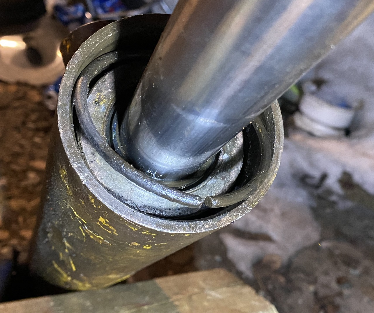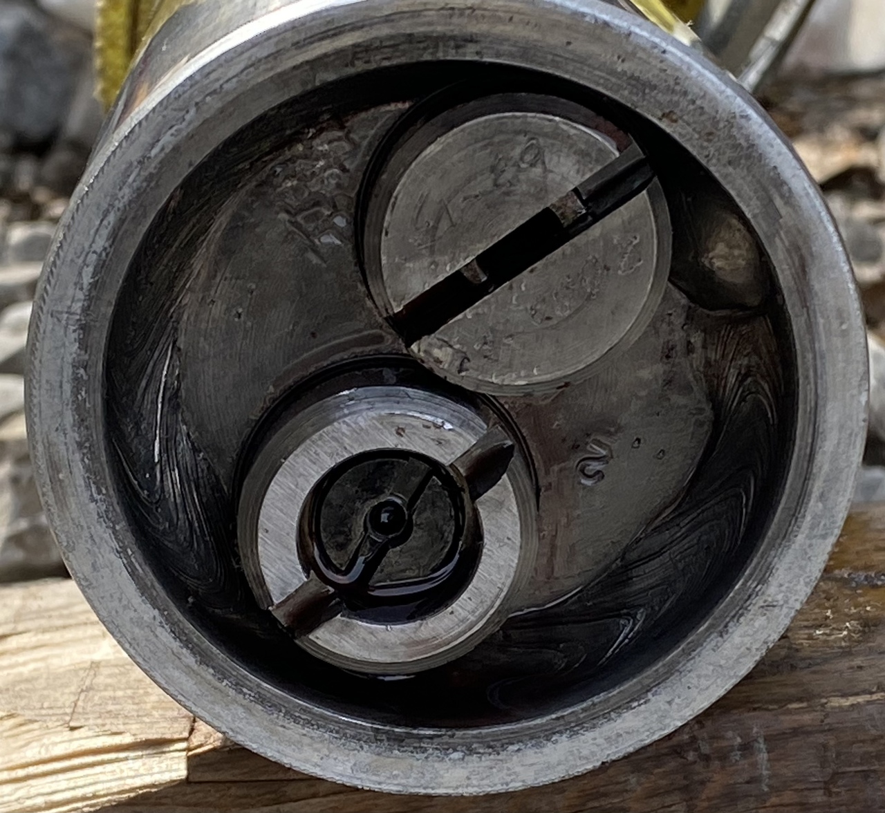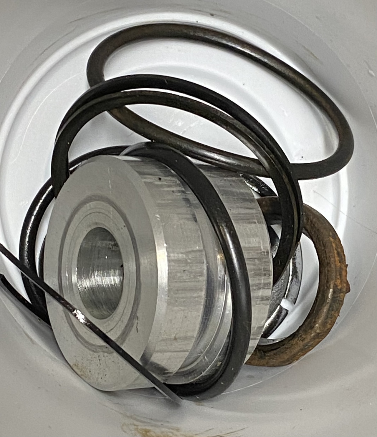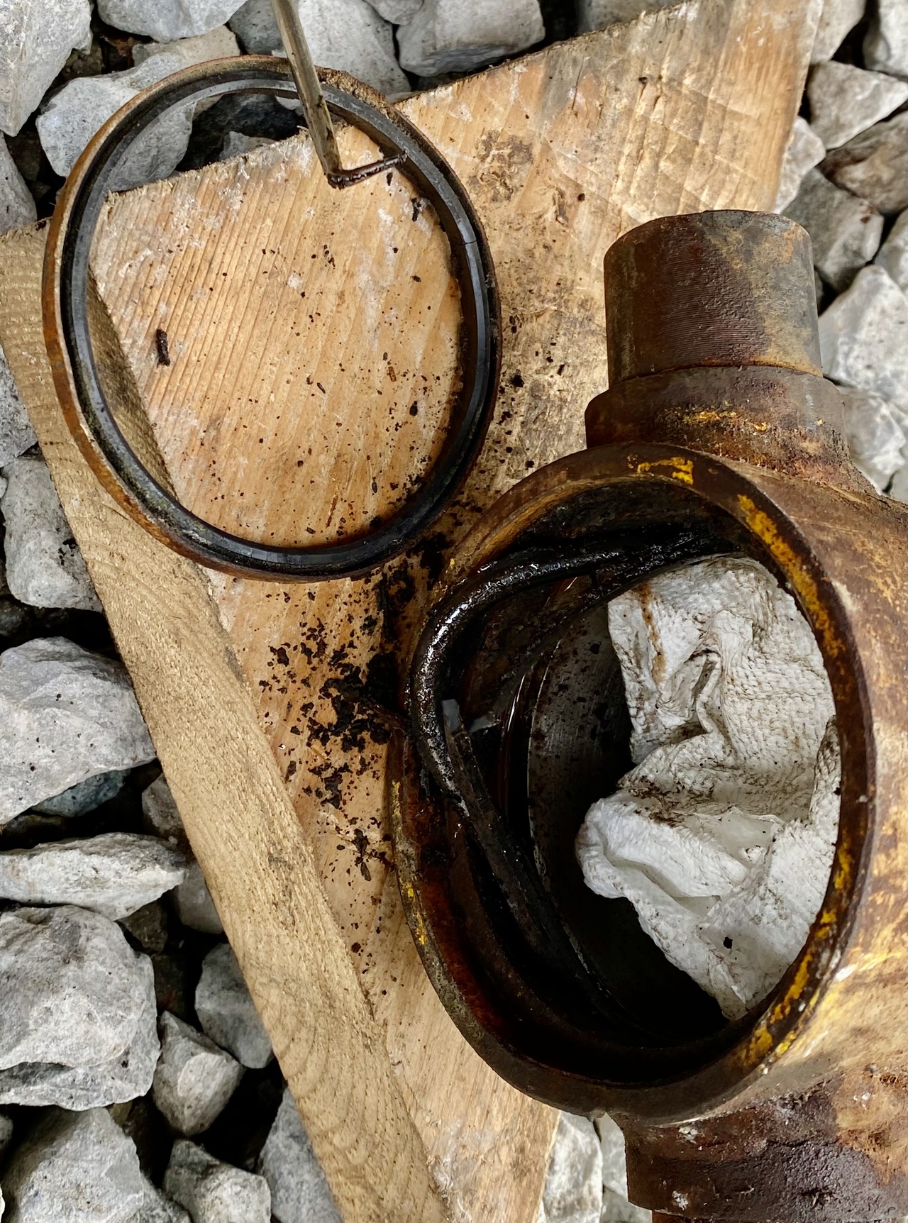 The main relief valve though, is more complicated. Once it was out it was clear someone's been there before. At the vertically bottom there's a steel mesh screen held in place by an internal snap ring/circlip. One eyelet on the circlip was broken.