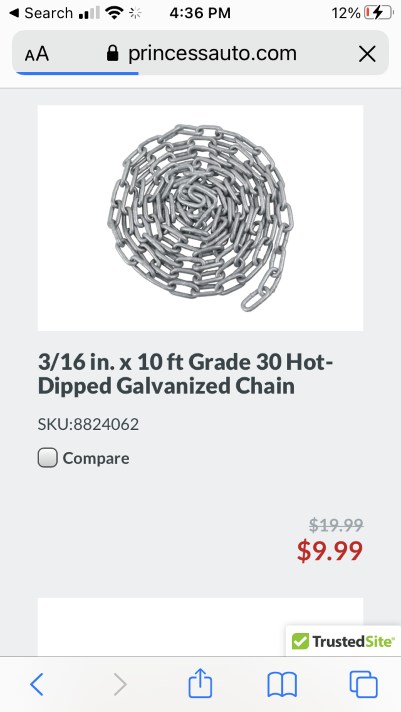 So did more thinking on the chains ! I ended up at Princess auto and bought some chain. 40 feet’s worth. On sale if any of you are looking for chain!
