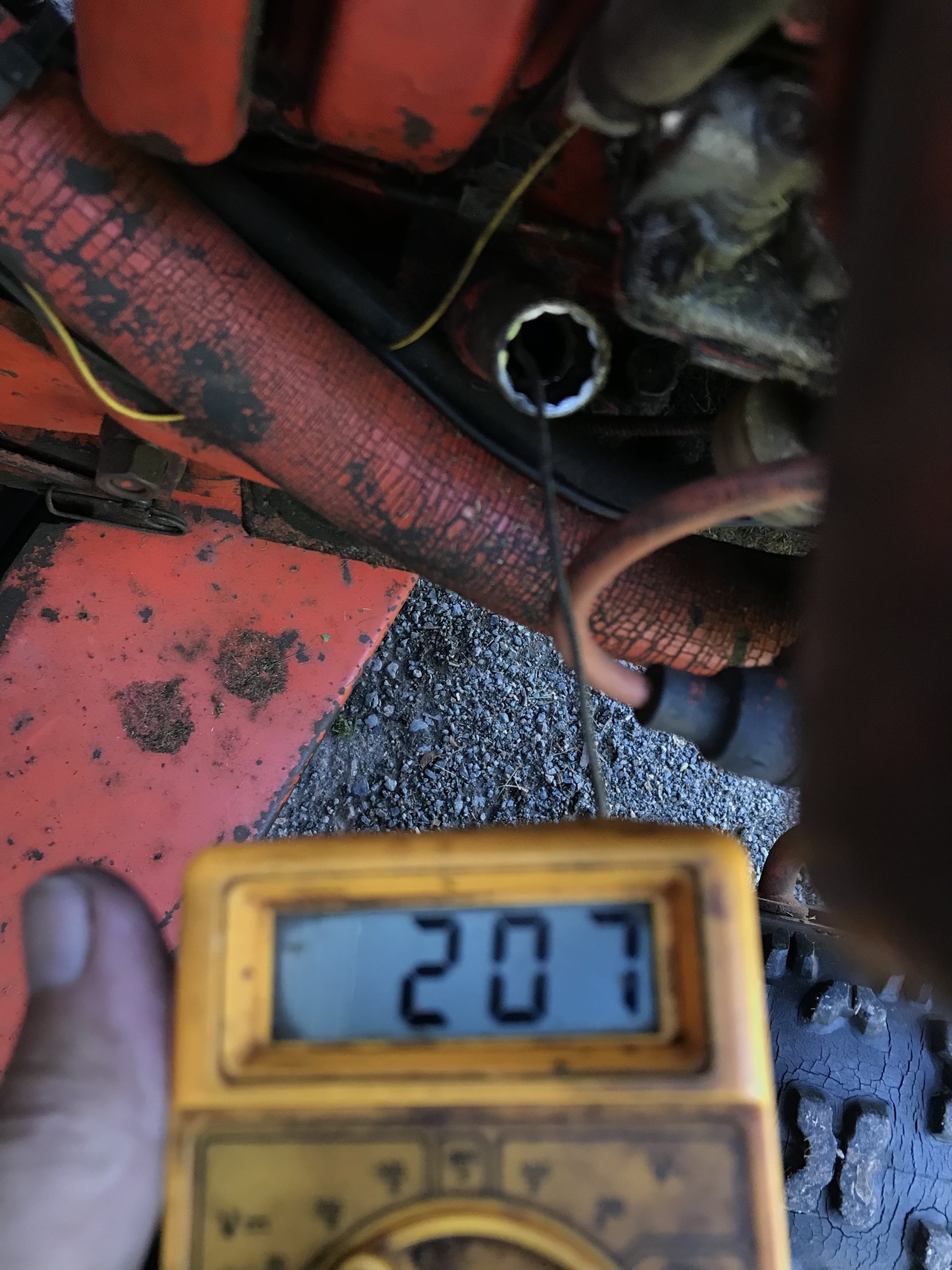 Ordered a thermocouple thermometer from ebay a while ago and it finally arrived. I measured the temperature of the oil right after I turned the tractor off and it was 174F. At the same time the probe under the spark plug measured 313F. Quite a difference!