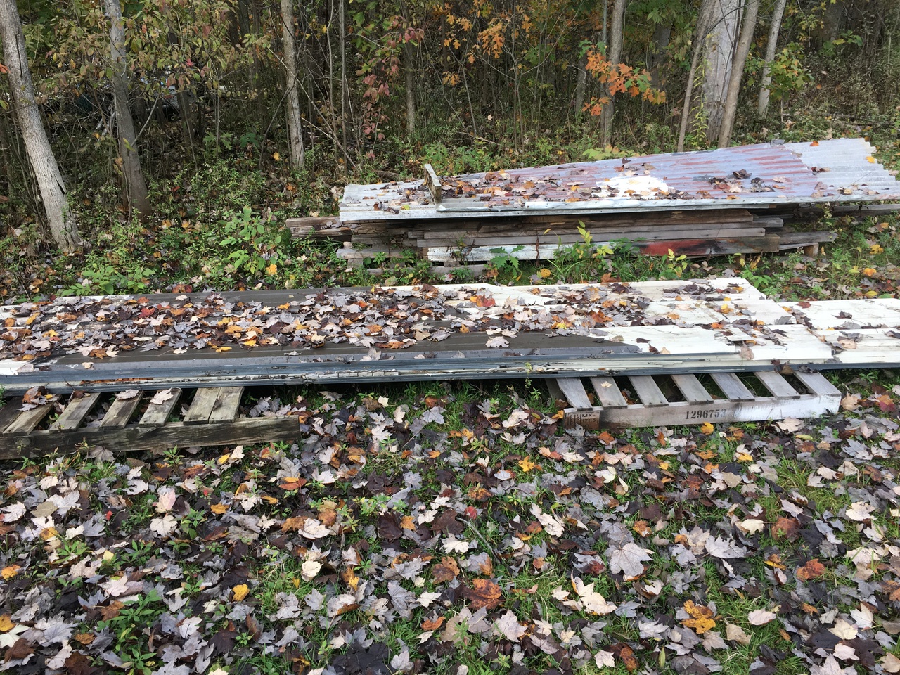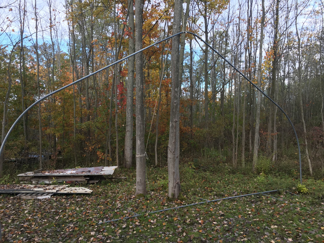 I purchased a hoop house frame work for scrap a price about five years ago. The owner said it was a frame work for a wedding tent, I thought it looked more like a hoop house but it was more pointed at the top instead of a U shape. I just put it on pallets in a clearing in my woods behind my house. About a month ago I put together one section just to see how big it was. From ground to peak it is twelve feet high and from leg to leg it is twenty eight feet. I have enough sections to make it fifty feet long if I space them every five feet apart. That would make a enclosure twenty eight feet by fifty feet. I was planning on covering it with a tarp and some old metal siding spaced close enough to help support the tarp. This would be quite a substantial enclosure with plenty of room to hide my stuff that I have setting out in the weather. Which is mostly some scrap metal, a few rain barrels and some items in my metal building that take up space. Things like rear rototillers, back blade, mowing decks, spray rig, lawn roller and the like.