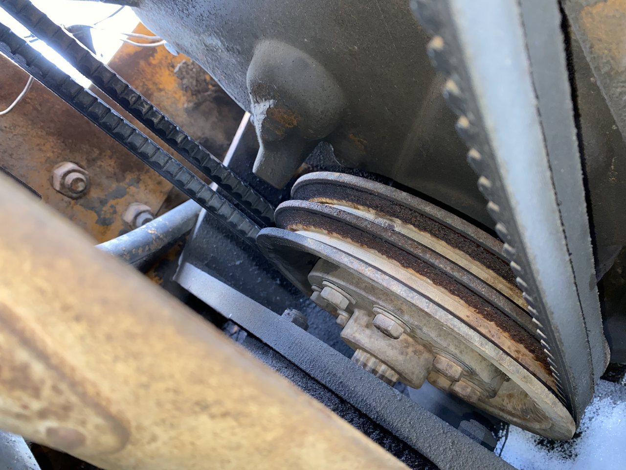Dave, hydraulic fluid from the pump just can't make it into the engine through there. It's hard to take a good picture of that area, but here it is. The hub on the crankshaft pulley is bone dry. You can see the splined pump shaft is dry too. Looks like there's some leak around the pump somewhere but that can't make it into the crankcase.