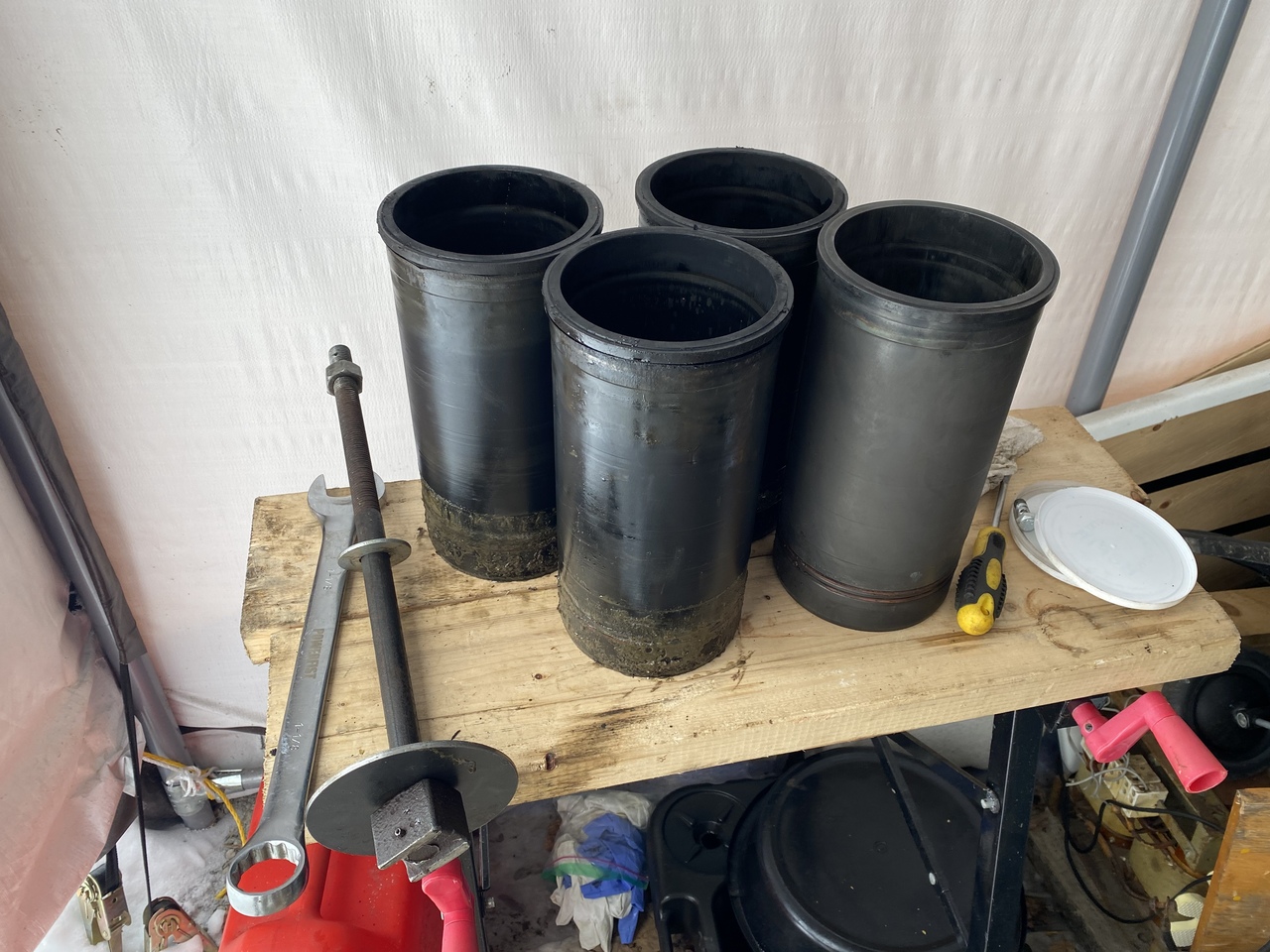 The seals arrived yesterday so I installed them all. The interesting one this time was the ptfe piston middle band that goes on top of the square rubber profile ring called the energizer. It's the yellow one you see in the image below. It's very stiff so it needs to be warmed up and stretched a tiny bit to make it to the middle of the piston. I used hot water and carefully stretched it just enough to get it on the piston. But, you also need to compress it back or else the piston won't go into the barrel. I first put a layer of electrical insulation tape and left it over night compressed by the piston ring installation tool.