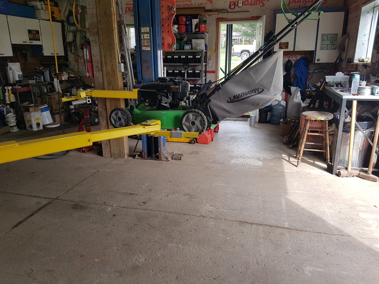 Cub Cadet , 54" commercial mower . 234 hrs and 2 out 3 deck spindles (not greasalbe) with bottom bearing failure . One year old still under warranty . They tell him they can have new bearings in a couple days but can't get to it for a month to do it under warranty . He needs it now so guess who is doing it . I found it doing spring maintenance for him . The deck wieghs a ton , with the lift I don't have to remove it to do the work on it . :thumbsup: