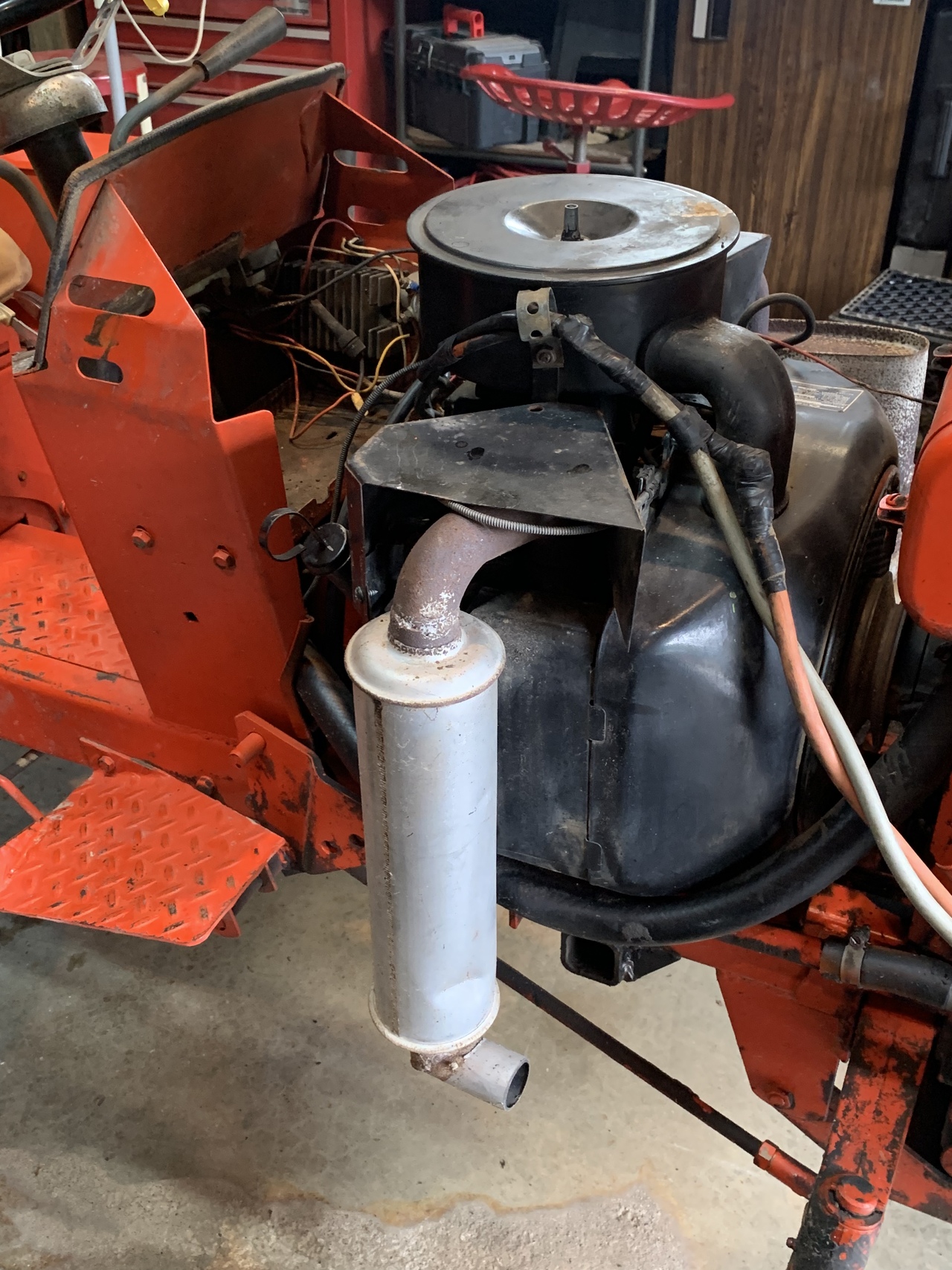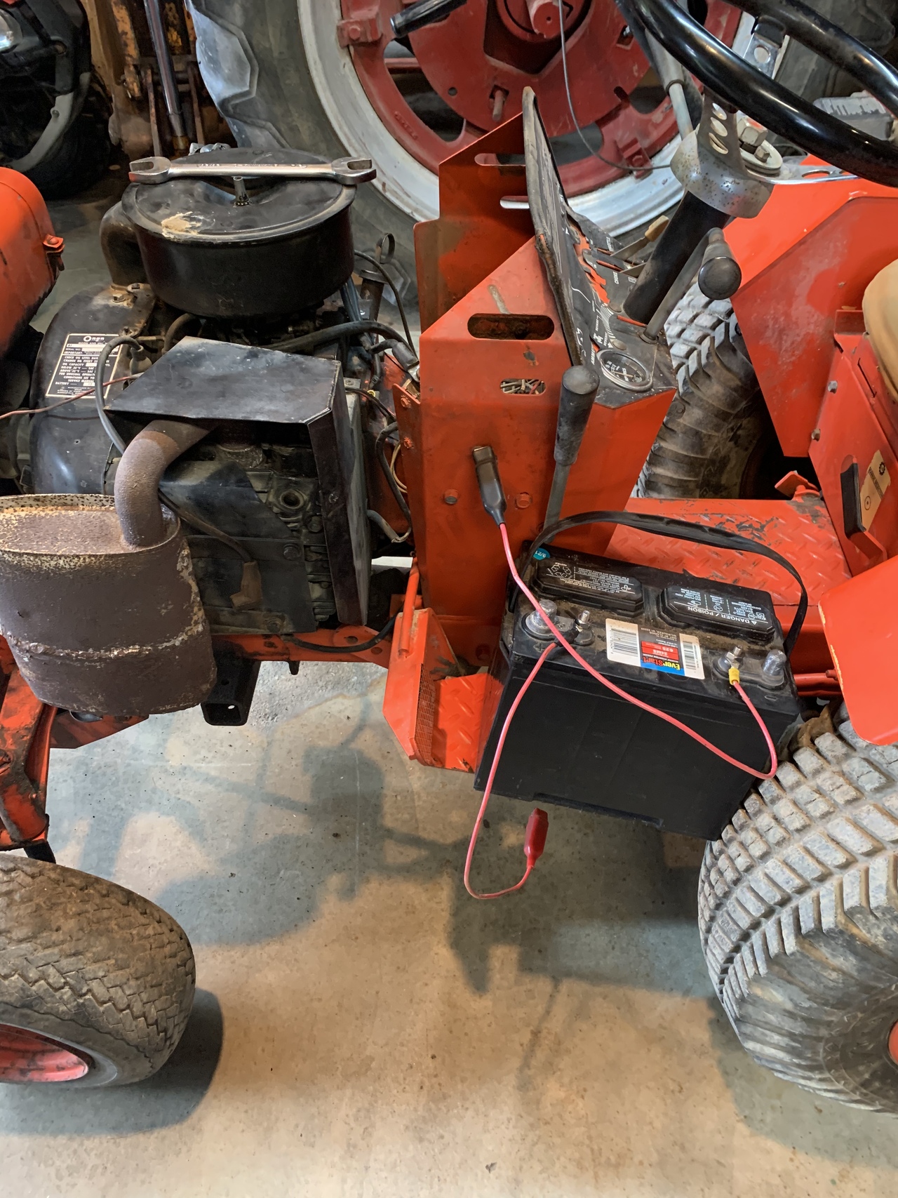I cleaned the plugs up and hooked the battery back to the tractor and turned the key to run and ran a jumper across the solenoid. Engine cranks, and I have good spark! Well I can’t stop now! I poured a little gas down the throat of the carburetor and again jumped across the solenoid. It stared right up! I know you can’t tell by a picture but it’s running! Can’t believe it. That about the easiest get it running project I’ve ever had! Hydraulics work I drove it around a bit. So now it’s full steam ahead! It needs a starter solenoid and wiring, fresh fluids, and we should probably check the rear end. Pretty good results for a short time in the shop!