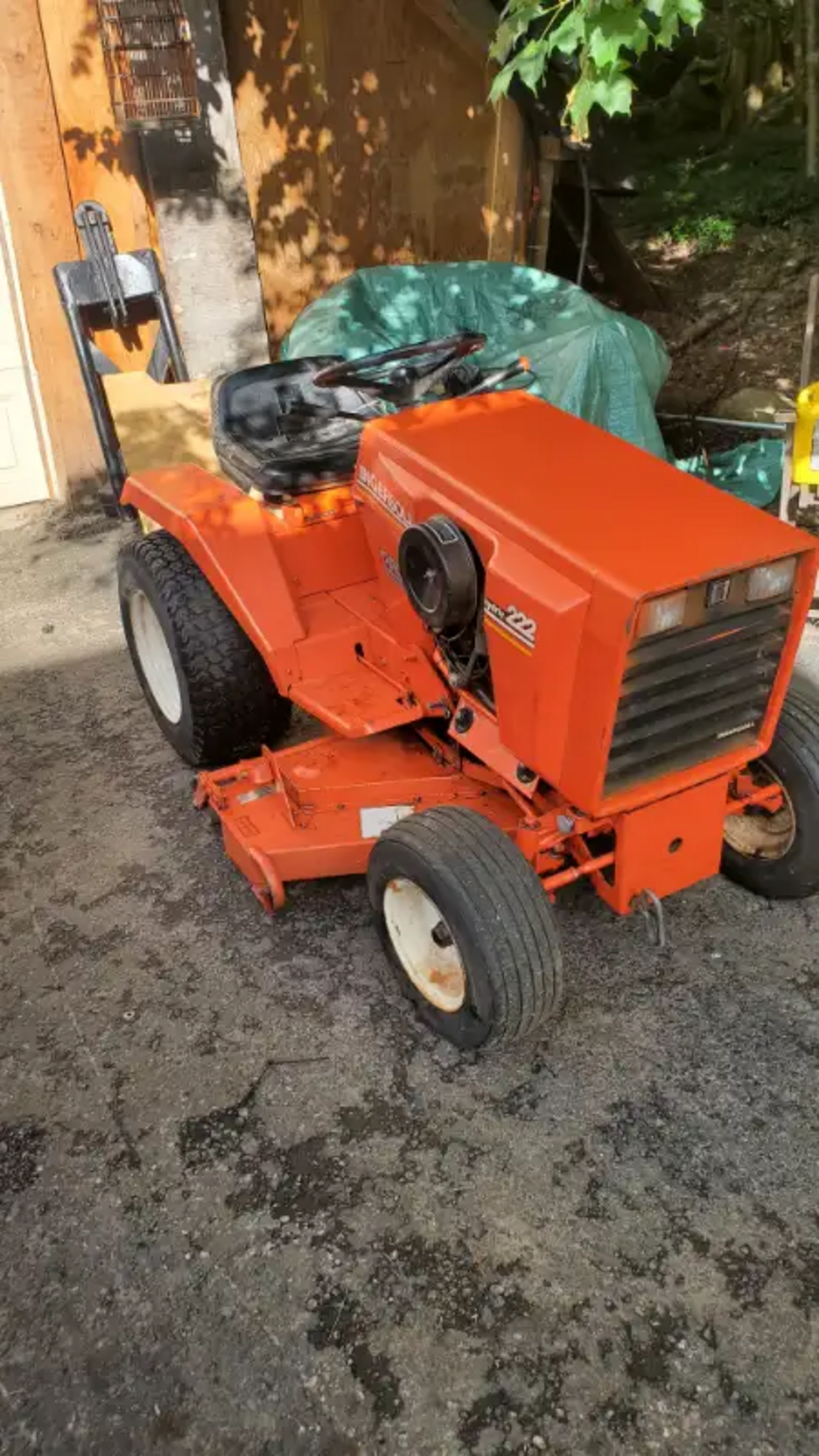 This is a 1987 Ingersol (Case) 222 tractor. It has rear center discharge for sweeper (the sweeper needs maintenance - needs spring or something - but any sweeper will work). It has a push blade.