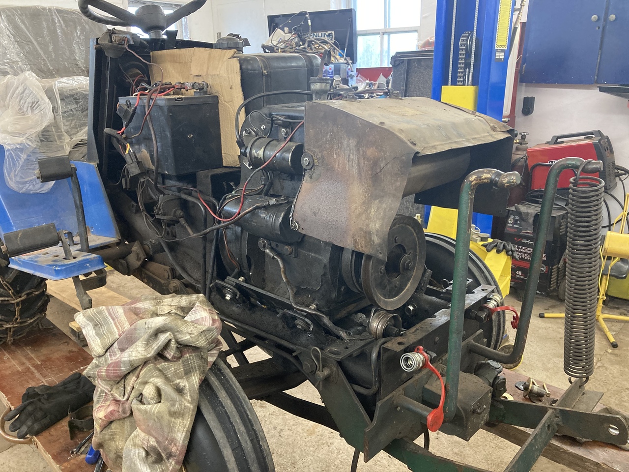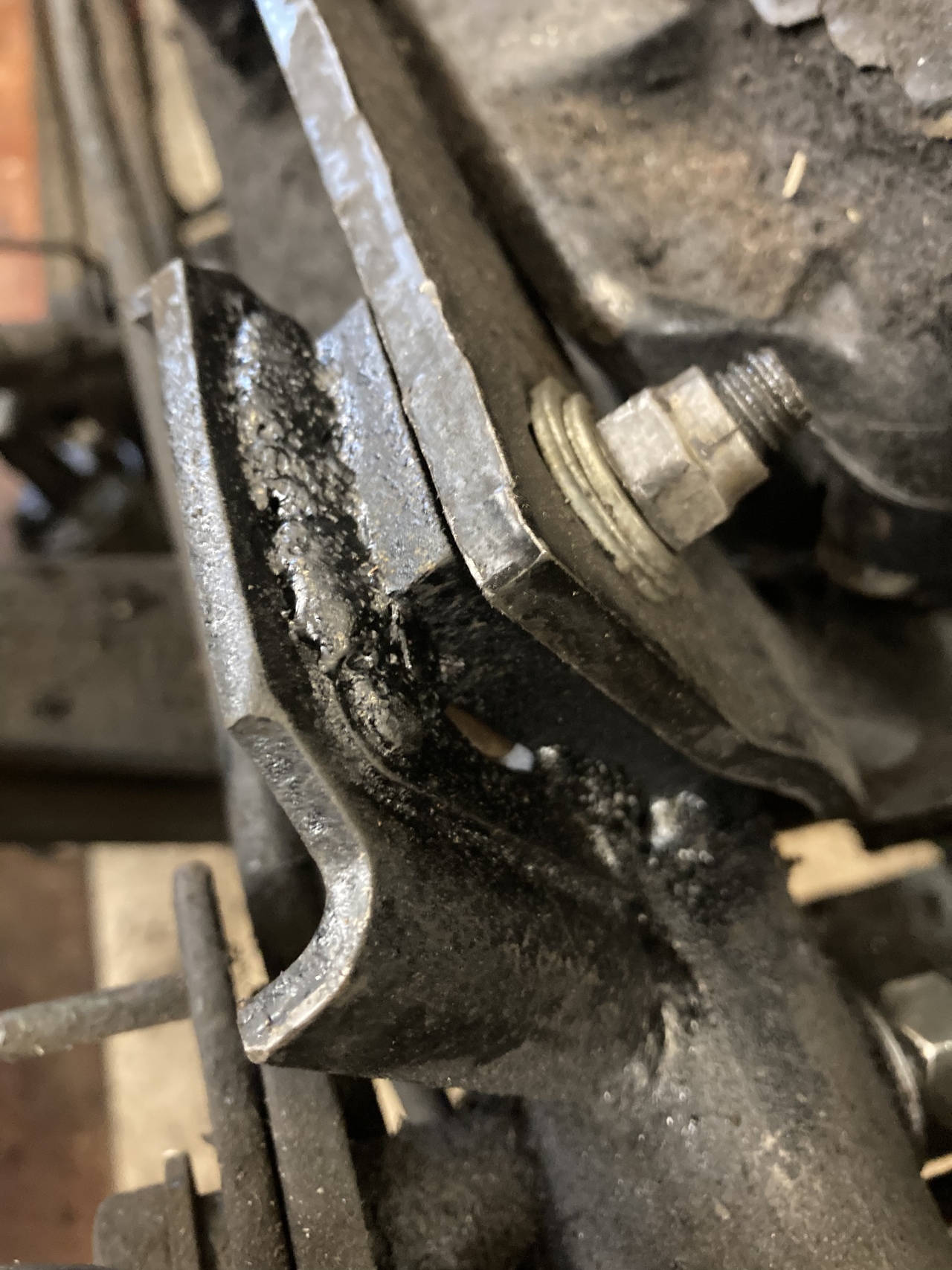 It broke one of the engine mounts of the frame. Never like those rubber mounts. So welded the mount back on. Took all the old rotted broken rubber mounts out. Enough of that. Welded metal blocked in with holes in them. The engine mount will bolt to the new blocks. And engine will be solid. Just like the older ford tractors that had the engine base welded to the frame. So lots to do yet, but the motor should be bolted in tomorrow. Then it’s on to see if this engine will run. If so, on to finish the install, service the tractor, put the tin work on and install the blower and service it.