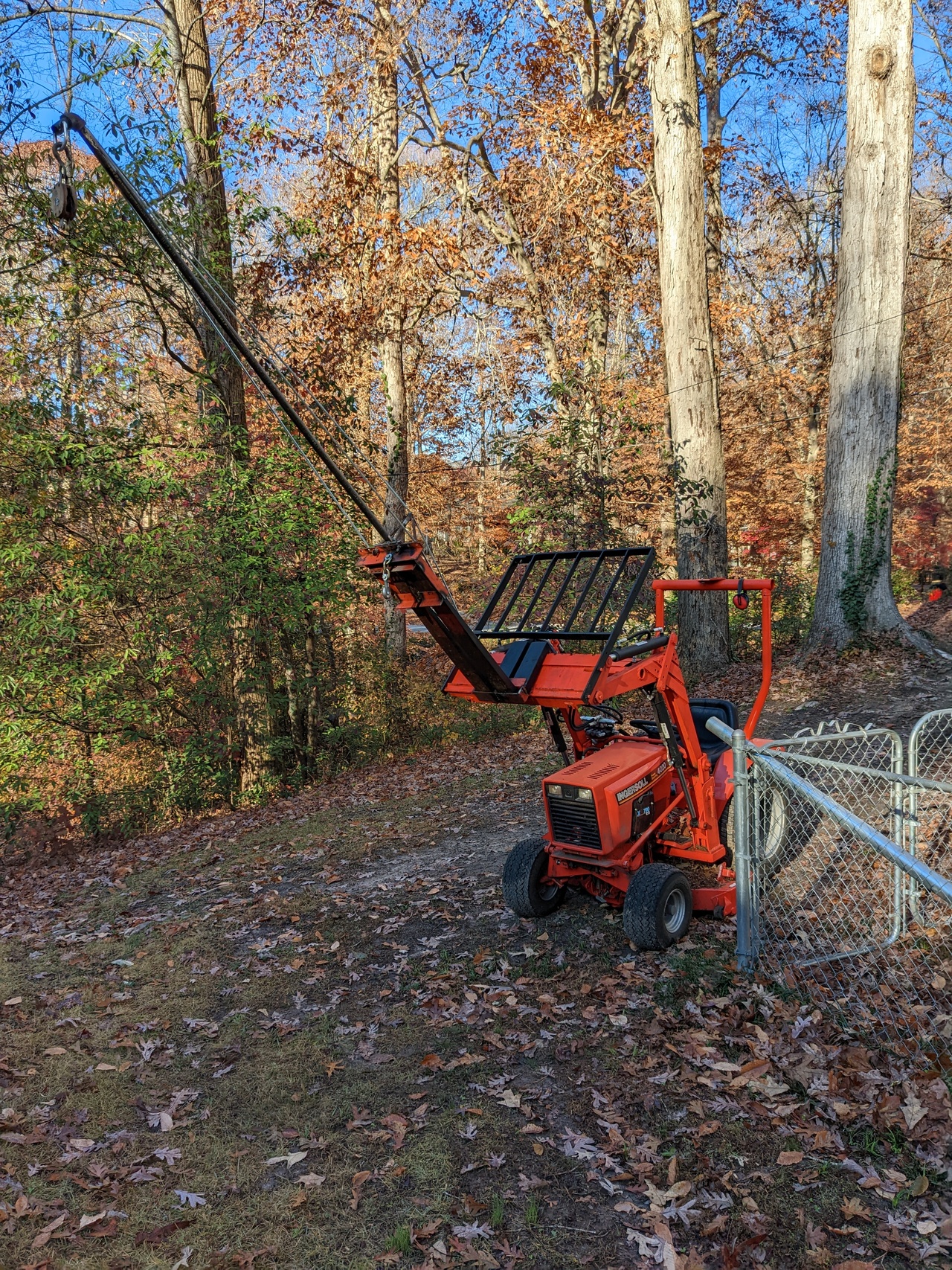 So in the end, the D-ring can go about 14' high, and has a lifting capacity of between about 100 and about 400 lbs, depending on the tilt and position of the pallet forks.