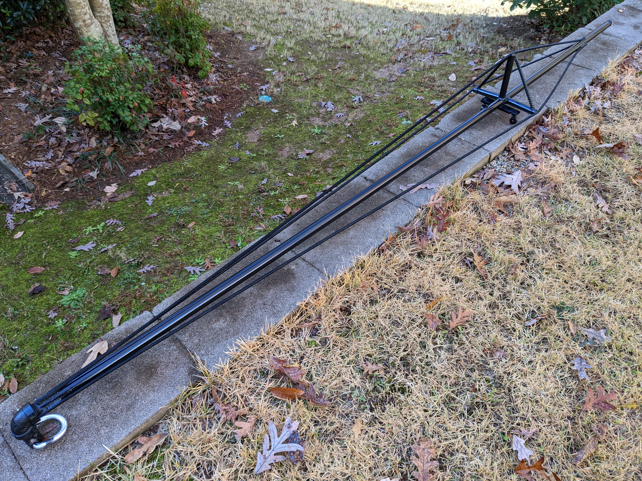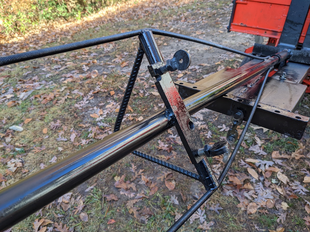I took a 10' long piece of 1 inch pipe and welded on a series of top, left side, and right side cantilevered tension braces. It only weighs about 35 lbs. The tension braces are 3/8" all-thread. Then I created a screw-in stub piece up at the lifting end that contains a D-ring from which to suspend a load. Then I welded a piece of flat bar to the bottom of the extension boom right at the fulcrum point where the boom rests on the front flange of the lifting adpater. I drilled and tapped the bar so that it can be bolted to that flange with 1/2" wing bolts. Then I made a "tailpiece adapter", a bracket that slides to the back end of the pallet forks, and captures/holds the tailpiece of the extension boom. So you slide on the tailpiece adapter, and then slide on and pin in place the lifting adapter. Then you slide the tailpiece of the extension boom into the tailpiece adapter, and bolt the boom's bottom plate to the front flange of the lifting adapter.