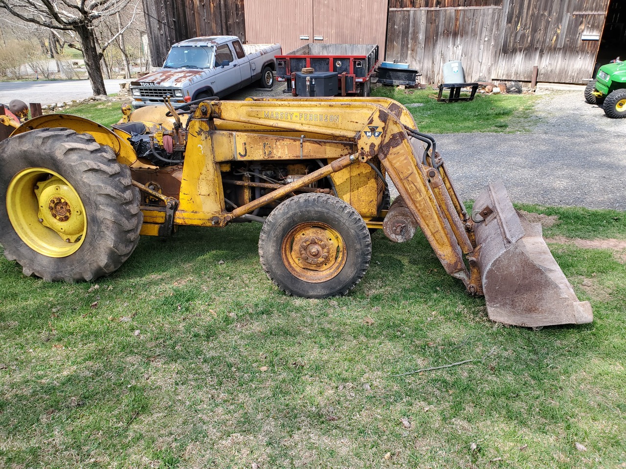 The front end though is still in pretty good shape. Because we had the JD 300, and that's a far more pleasant machine to operate, this has had an easy life with us. We rebuilt the hydraulic system when we got it, so that's still in good shape. Also completely redid the power steering, and that is the nicest steering on any of our machines. It has a transmission PTO, so it used to pull our potato digger, as our 8N didn't really have the right gear set for that operation in our soil. Has a Continental 4 cyl engine that is so damn reliable it boggles my mind. It gave me some fits last fall, so I just left it until last weekend. Pulled the distributer cap, and brushed a little corrosion off the rotor, and then ran a file between the points. Fired right up after that. Charging system is out unfortunately. I've fought with that too much at this point. I think I'll be converting over to an alternator at some point to get a little more reliability , and charge at lower RPM. I also need to come up with some kind of counterweight for the back, as it's a pig on skates with the big flotation tires, and no weight. With the hoe, it's fine, but well, that isn't likely any more... Loader works nicely. If I plan on using it much, I'd have to take a look at all the lines, but it lives in the barn, so UV hasn't really had its way with the rubber. Last time I used it was a couple years ago to move the ballasted tires for the JD 300 when we replaced them. Please excuse the bloody JD ag yellow rears. My uncle has an issue with that damn color....