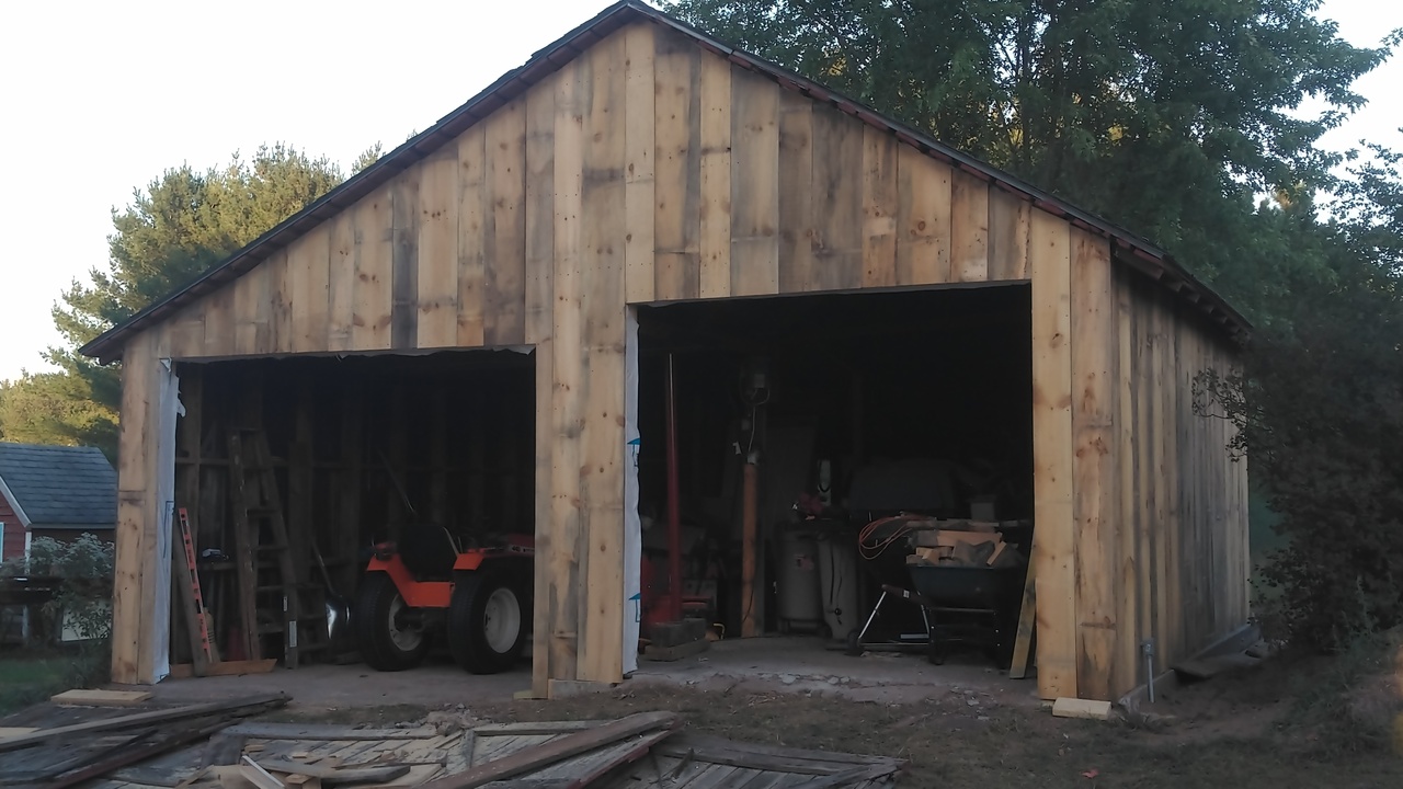 The old doors are going back on for now. Next step to get all the stuff that got pushed to the back moved so I can stared on the back wall. The north wall is ready to have the old boards removed and new put on but waiting for the grape's to get ripe.